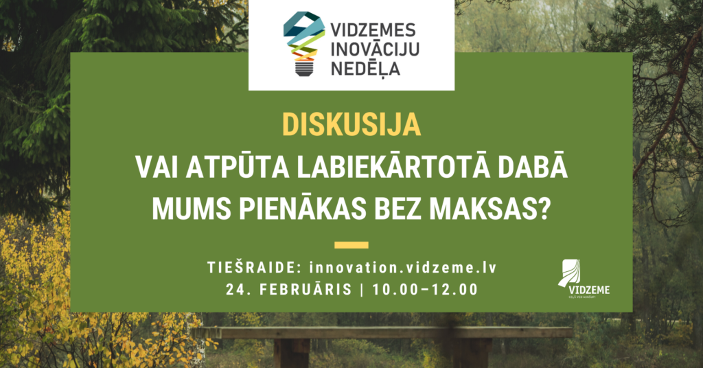 Vairāk informācijas un reģistrēšanās šajā saitē: http://innovation.vidzeme.lv/lv/pasakumi/2021-02-24/diskusija-vai-atputa-labiekartota-daba-mums-visur-pienakas-bez-maksas.html