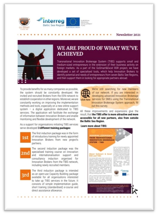 Decembra izskaņā projekta GoSmart&Excel BSR komanda sagatavojusi noslēdzošo projekta ziņu lapu angļu valodā, kurā apkopoti projekta galvenie ieguvumi, 9 mēnešu laikā sasniegtie rezultāti un turpmākie plāni, projektam noslēdzoties. Veiksmīgi realizēts arī galvenais uzdevums – nodrošināt uzņēmējdarbības atbalsta pasākumus, turpinot inovāciju brokera tīkla atbalsta kvalitātes un pieejamības uzlabošanu, kā arī izstrādājot Baltijas jūras reģiona (BJR) viedās specializācijas stratēģijas piedāvājumu, vadoties pēc Trans-S3 metodoloģijas.