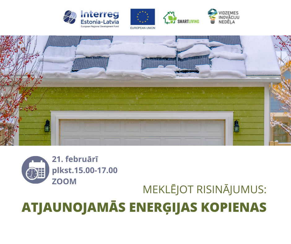 Pirmdien, 21. februārī plkst. 15.00 Vidzemes plānošanas reģions un projekts “Praktiski risinājumi gudrai energoresursu izmantošanai (Smart Living)” aicina interesentus uz tiešsaistes semināru “Atjaunojamās enerģijas kopienas”. Pasākums notiks Vidzemes inovāciju nedēļas 2022 ietvaros, aktualizējot kopienu spēku individuālas enerģijas sistēmas izveidei, lai uzlabotu savas dzīves apstākļus un mazinātu atkarību no fosilajiem enerģijas resursiem. Semināra dalībniekiem tiks demonstrēts arī Smart Living izstrādātais interaktīvais bezmaksas rīks individuālam mājsaimniecību energoefektivitātes izvērtējumam https://smartliving.flowin.lv/.