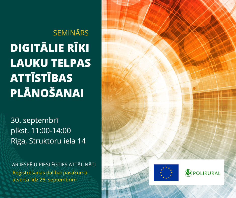 Piektdien, 30. septembrī, Agroresursu un ekonomikas institūtā Mazajā zālē Rīgā ( Struktoru ielā 14) no plkst.11.00 līdz plkst. 14.00 notiks klātienes (ar iespēju pieslēgties arī attālināti) seminārs “Digitālie rīki lauku telpas attīstības plānošanai”, kura ietvaros interesentiem būs iespēja iepazīties ar praktisku digitālo rīku izmantošanas iespējām reģionālās attīstības novērtēšanā un plānošanā. Plānošanas rīki izstrādāti starptautiska mēroga komandā, teju 40 Eiropas organizācijām un uzņēmumiem pielietojot plašas starpnozaru zināšanas un prasmes. Rīku izstrādē iesaistījušās arī četras organizācijas no Latvijas – Agroresursu un ekonomikas institūts, Baltic Open Solutions Center (BOSC), Vidzemes plānošanas reģions un Latvijas Lauku forums.