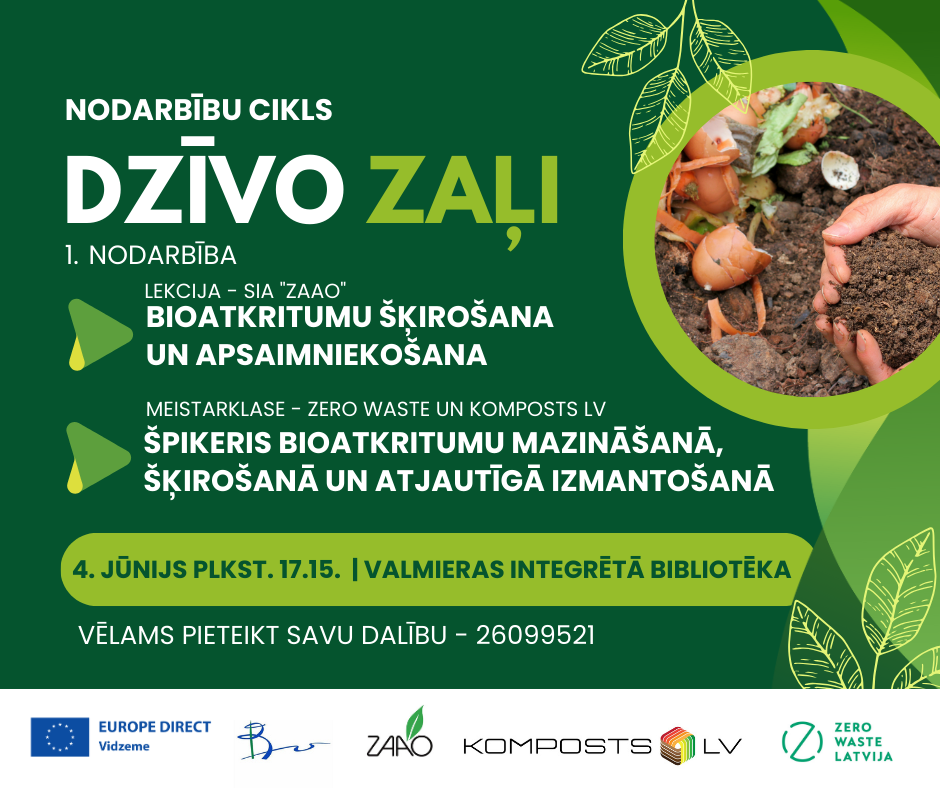 Nodarbību ciklā “Dzīvo zaļi” ir paredzētas trīs nodarbības, nākamās plānotas rudenī. Pasākumu organizē Europe Direct Vidzeme sadarbībā ar Valmieras integrēto bibliotēku. Vēlama iepriekšēja pieteikšanās, zvanot pa tālruni 26099521.