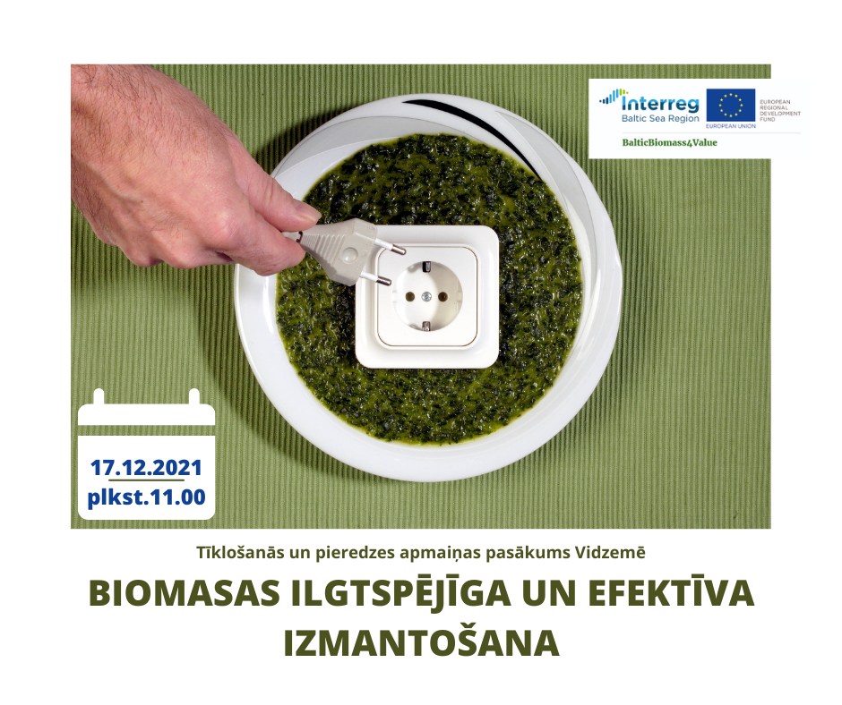 Š. g. 17. decembrī Vidzemes plānošanas reģions un projekta “Baltic Biomass4Value” komanda aicina Vidzemes bioresursu īpašniekus un pārvaldītājus, t. sk. gan publiskā, gan privātā sektora pārstāvjus, kā arī citus interesentus uz klātienes pieredzes apmaiņas un tīklošanās pasākumu. Pasākuma mērķis ir stiprināt bioresursu īpašnieku un pārvaldītāju zināšanas, tostarp informēt viņus par jauniem instrumentiem, kas brīvi izmantojami, mudinot mērķauditoriju plānot ilgtspējīgas un efektīvas biomasas izmantošanu.