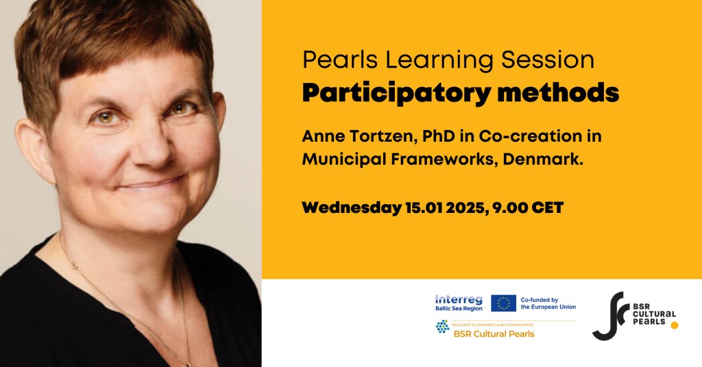 Projekta BSR Cultural Pearls sadarbības partneri aicina ikvienu interesentu uz mācību semināru “Līdzdalības metodes”, kas notiks 2025. gada 15. janvārī no plkst. 10.00 līdz 11.00 (pēc Latvijas laika) tiešsaistē. Kā runātāja uzstāsies zinātņu doktore (Ph.D.) Anne Tortcena (Anne Tortzen) no Dānijas, skarot tādas tēmas kā: