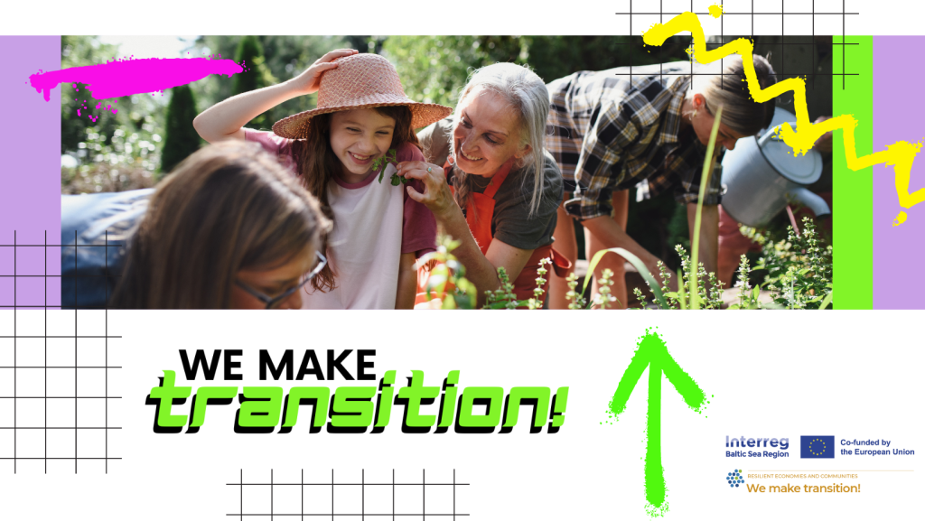 Interreg Baltijas jūras reģiona programmas projekta “We make transition!” partnerība aicina interesentus pieteikties tiešsaistes semināram “Kā kopā veidojam ilgtspējīgāku nākotni — labās prakses piemēri no projekta “We make transition!””, kas notiks 15. maijā no plkst. 13.30 līdz 15.30 Zoom platformā. Pasākums būs angļu valodā.