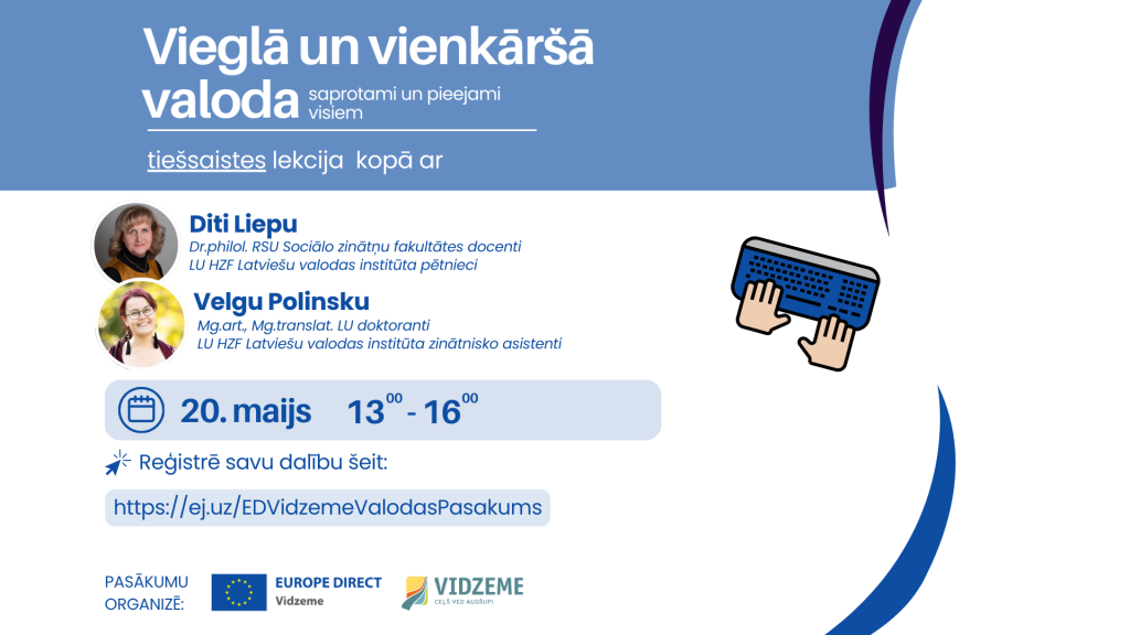 Lai palīdzētu stiprināt informācijas saprotamību un piekļūstamību, īpaši gatavojoties Eiropas Parlamenta un Padomes Direktīvas (ES) 2019/882 jeb “piekļūstamības direktīvas” prasību ieviešanai, EUROPE DIRECT Vidzeme aicina uz tiešsaistes lekciju “Vieglā un vienkāršā valoda – saprotami un pieejami visiem”.