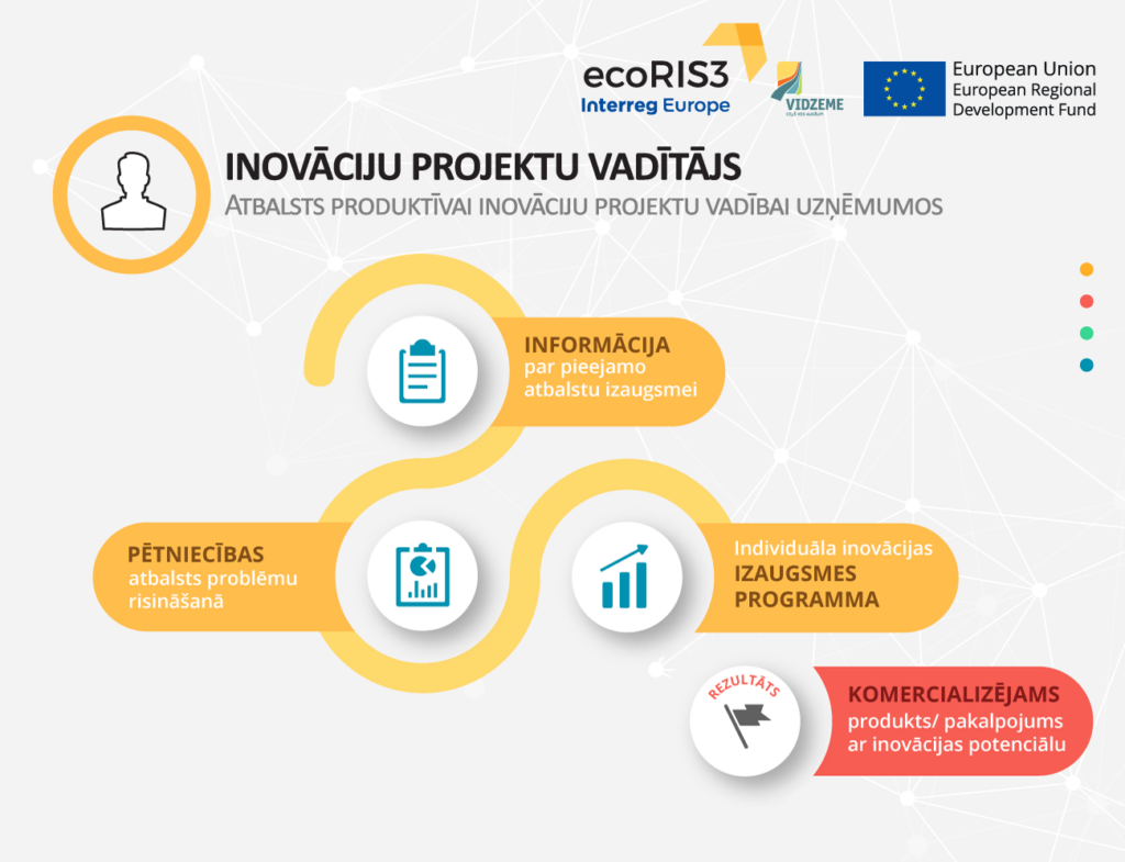 Aktivitātes notiek Vidzemes plānošanas reģiona īstenotā Interreg Europe programmas projekta “Vietējo un reģionālo inovāciju ekosistēmu atbalsta politikas instrumenti (EcoRIS3)” ietvaros. Tā mērķis ir uzlabot atbalsta instrumentus inovāciju vides veicināšanai Vidzemē viedās specializācijas jomās.