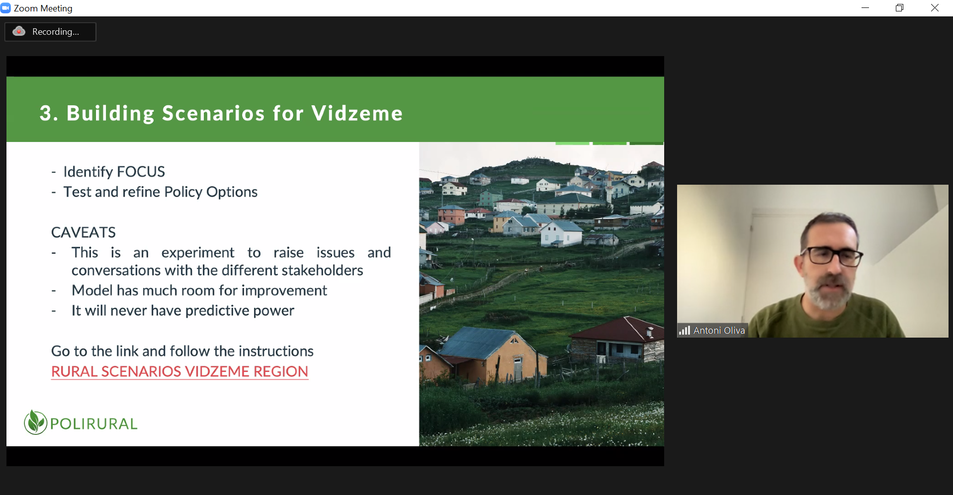 Antonijs Oliva Kesada (Antoni Oliva Quesada), attīstības konsultants un lauksaimniecības inženieris ar specializāciju sistēmdinamiskajā modelēšanā un reģionu un pilsētu attīstības scenāriju veidošanā (Barselona, Spānija) dalījās zināšanās par metodēm un instrumentiem, kā praktiski modelēt vietēja līmeņa attīstības scenārijus, un palūkoties, kādas ir nākotnes attīstības prognozes. Eksperts sniedza ieskatu par sistēmdinamiskās modelēšanas mērķiem un metodēm, padziļināti aplūkojot Vidzemes piemēru, t.sk. demonstrējot vietni, kurā izmēģinājuma variantā ikviens var novērot un vērtēt no dažādiem procesiem izrietošās nākotnes kopsakarības.