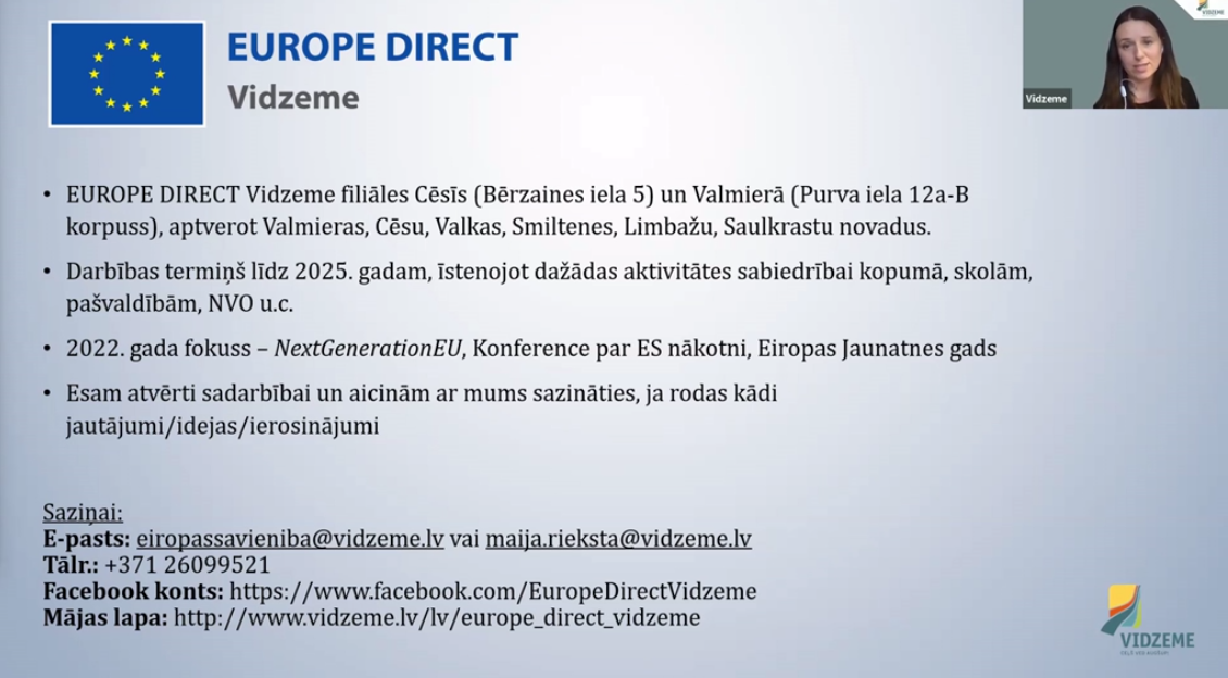 EUROPE DIRECT Vidzeme vadītāja Maija Rieksta pastāstīja par centru tīklu Eiropas Savienībā un Latvijā, vēršot uzmanību uz plānotajām aktivitātēm nākamgad. Centrs veido būtisku saikni starp ES institūcijām un iedzīvotājiem, palīdzot skaidrot, kādi resursi un atbalsts pieejams visdažādākajām sabiedrības grupām, kā Eiropa kopīgi pārvar COVID-19 pandēmiju, kā tiek veicināta ekonomiskā attīstība ar #NextGenerationEU programmas starpniecību un kā notiek pāreja uz zaļāku un digitālāku vidi, lai sasniegtu klimatneitralitātes mērķus. Centra mērķauditorija galvenokārt ir sabiedrība kopumā, vienlaikus arī vairākas no aktivitātēm būs specifiski paredzētas auditorijām izglītības iestādēs, nevalstisko organizāciju sektorā, pašvaldībās u.c.