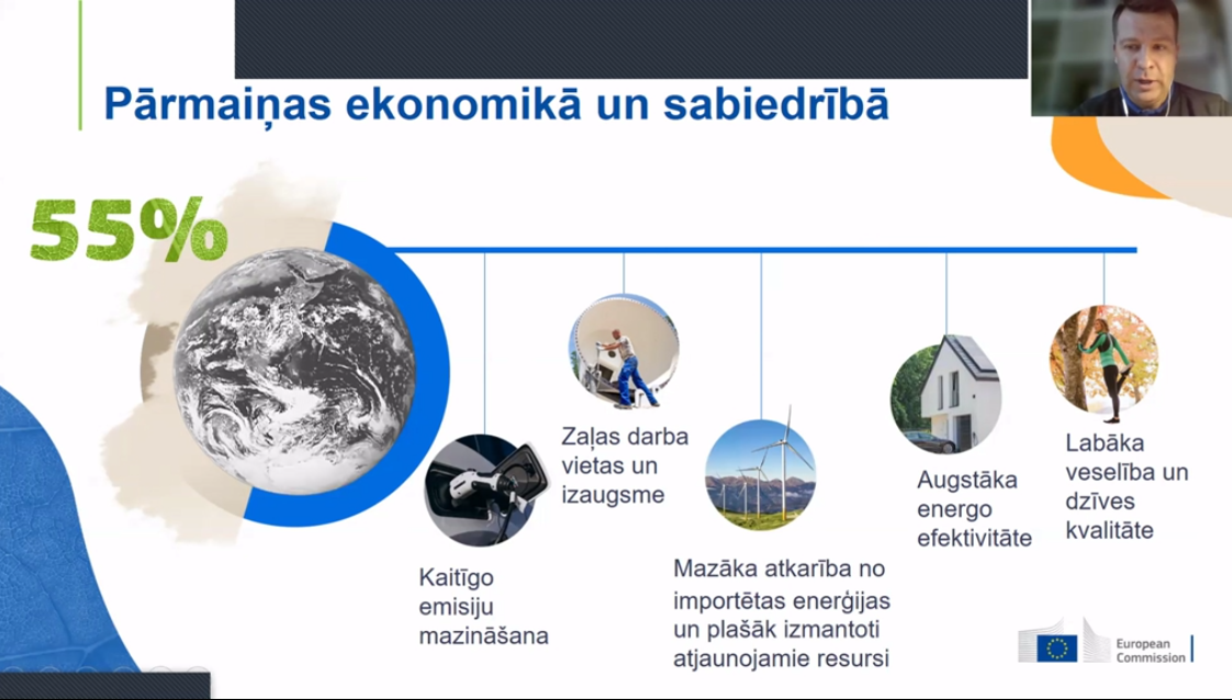 Eiropas Komisijas pārstāvniecības Latvijā vadītājas vietnieks un Politikas nodaļas vadītājs Mārtiņš Zemītis semināra dalībniekiem piedāvāja detalizēti aplūkot Eiropas Zaļo kursu un ar to saistītos izaicinājumus un iespējas Latvijas pašvaldībās. M. Zemītis norādīja, ka Latvijā visvairāk uzmanības būtu jāpievērš atjaunojamās enerģijas ražošanai, ēku renovācijai un mazemisiju transportlīdzekļiem un ka publiskajam sektoram ir jākļūst par labo piemēru citiem. Šo mērķu sasniegšanai nākamajā plānošanas periodā paredzams Eiropas Savienības atbalsts.