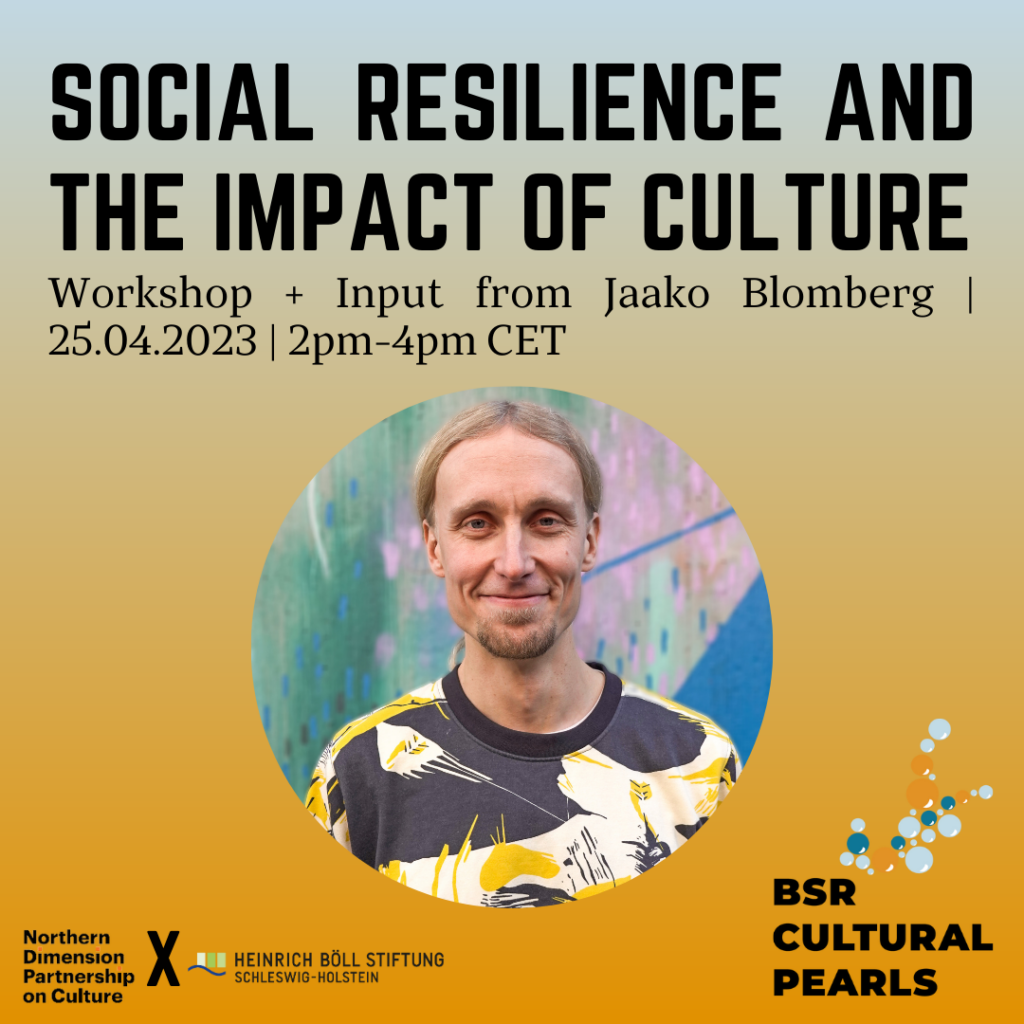 Ceturtdien, 25. aprīlī, plkst. 15.00 pēc Latvijas laika projekta BSR Cultural Pearls partnerība aicina interesentus pievienoties tiešsaistes darbsemināram par kultūru un sociālo noturību jeb dzīvotspēju (eng. – social resilience). Darba valoda – angļu.