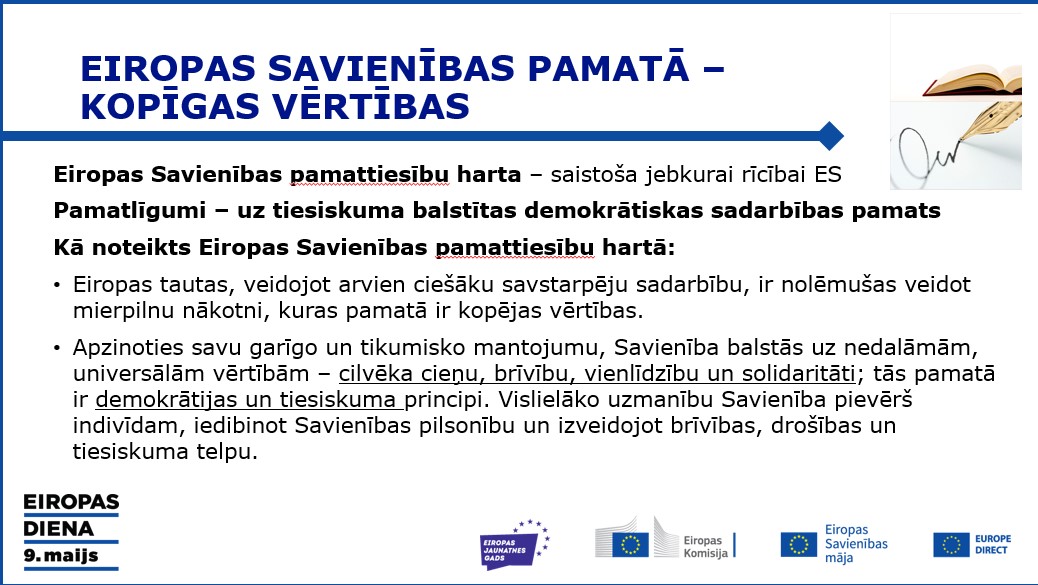 Vidzemes plānošanas reģiona projektu vadītāja un EUROPE DIRECT Vidzeme vadītāja Maija Rieksta šo iespēju izmantoja, lai klātienē satiktos ar Valmieras 5. vidusskolas audzēkņiem un pastāstītu par Eiropas Savienības vērtībām: brīvību; demokrātiju; solidaritāti; tiesiskumu; toleranci un dzimumu līdztiesību.