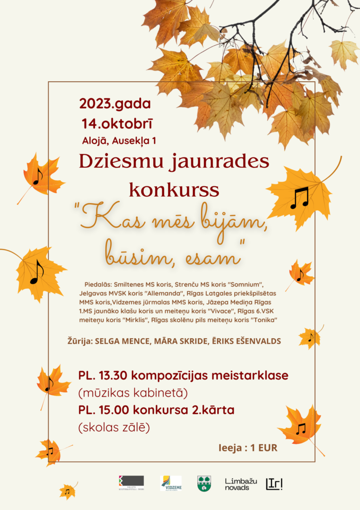 2023. gada 14. oktobrī Alojas Ausekļa vidusskolas zālē notiks ikgadējais dziesmu jaunrades konkurss “Kas mēs bijām, būsim, esam”. Dziesmu jaunrades konkursam, kura profils ir latviešu tautasdziesmu apdares, šogad iesniegti 15 jaundarbi. Dziesmu autori ir mūzikas skolu, mūzikas vidusskolu audzēkņi, JVLMA studenti un jaunie komponisti līdz 30 gadu vecumam.