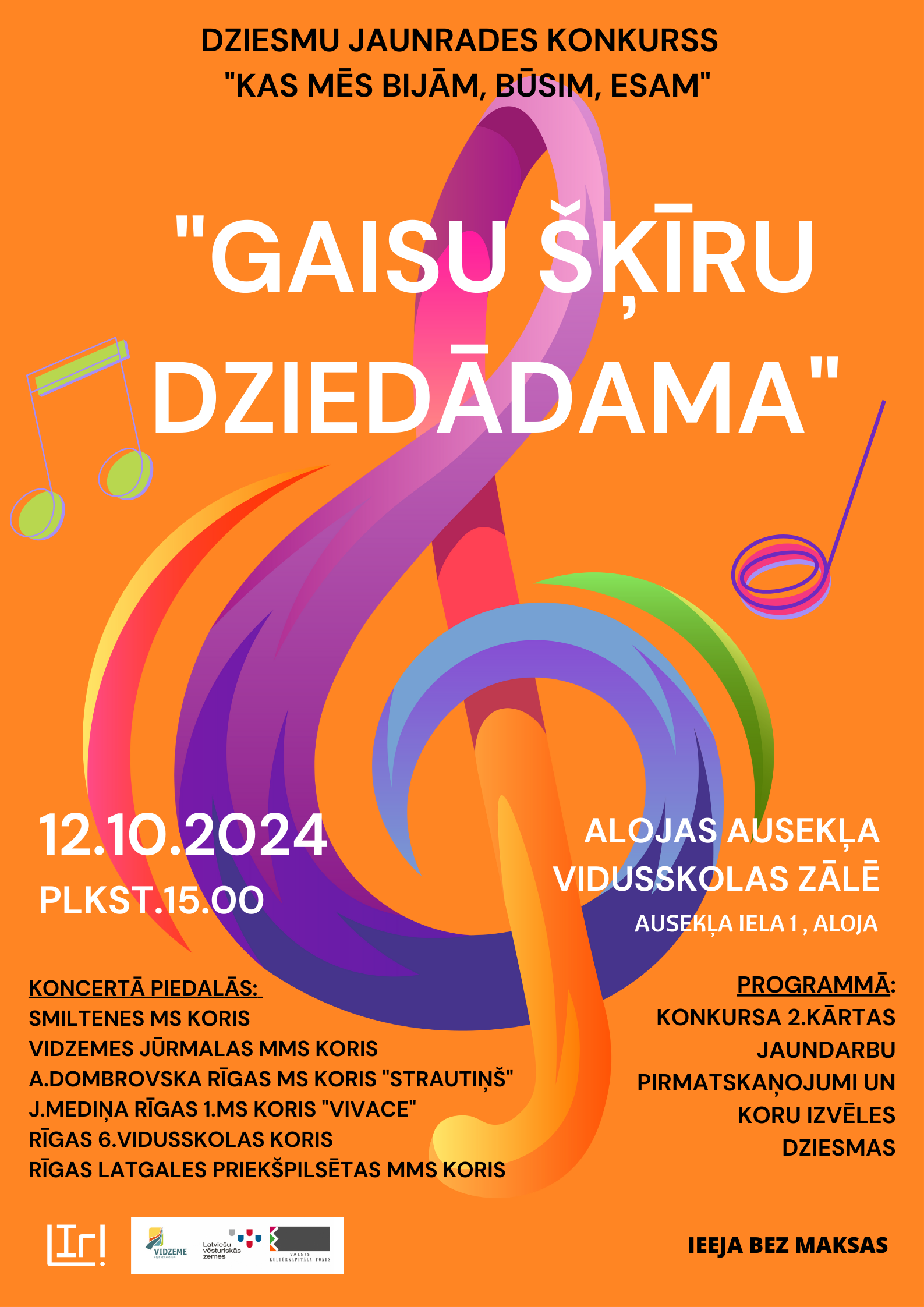 2024. gada 12. oktobrī plkst. 15.00 Alojas Ausekļa vidusskolas zālē skolēnu kori pirmatskaņos vienaudžu sacerētās dziesmas, kas izvirzītas dalībai dziesmu jaunrades konkursa “Kas mēs bijām, būsim, esam” 2. kārtā. Šogad konkursam tika iesniegtas 12 oriģināldziesmas divās vecuma grupās. Uz konkursa 2. kārtu žūrija – komponisti Selga Mence, Ēriks Ešenvalds un kordiriģente Māra Skride, izvirzīja septiņas dziesmas.