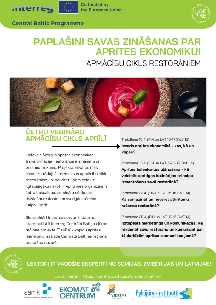 Tiešsaistes semināri ir bez maksas, un tajos var piedalīties visi interesenti. Tie ir daļa no starptautiskā Interreg Central Baltic projekta “Ce4Re” – kopīgu aprites risinājumu izstrāde Centrālbaltijas restorānu nozarē.
