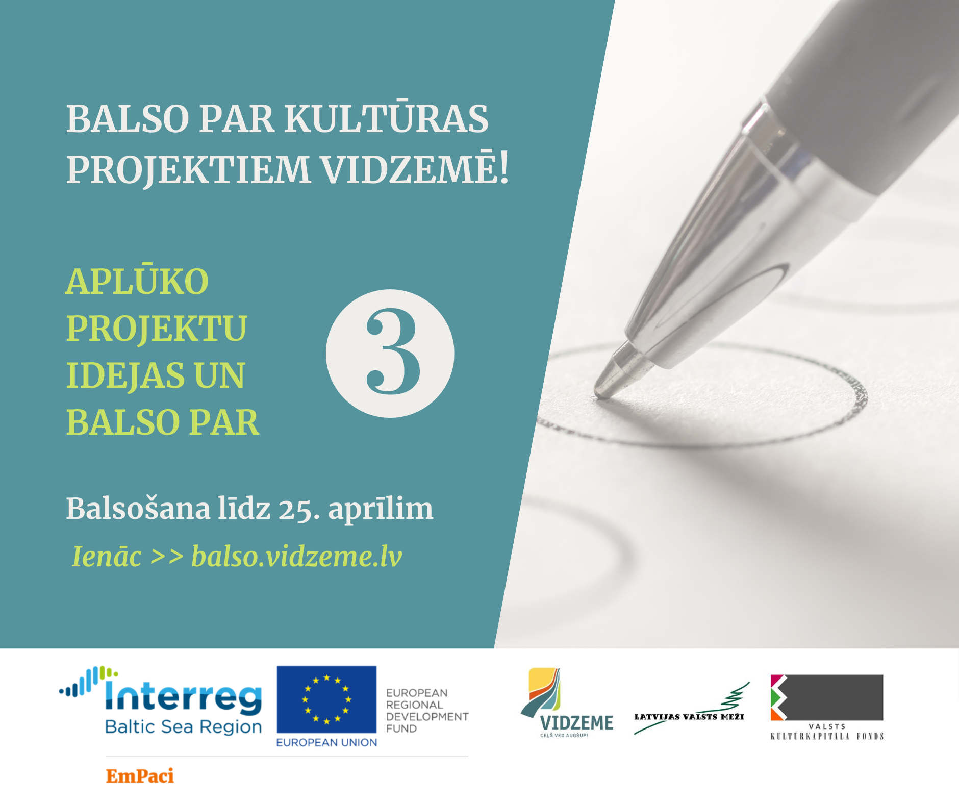 Vidzemes plānošanas reģions aicina līdz 25. aprīlim balsot par konkursam “Vidzemes kultūras programma 2021” iesniegtajiem projektiem. Ar balsojuma rezultātiem tiks iepazīstināta projektu vērtēšanas ekspertu komisija.