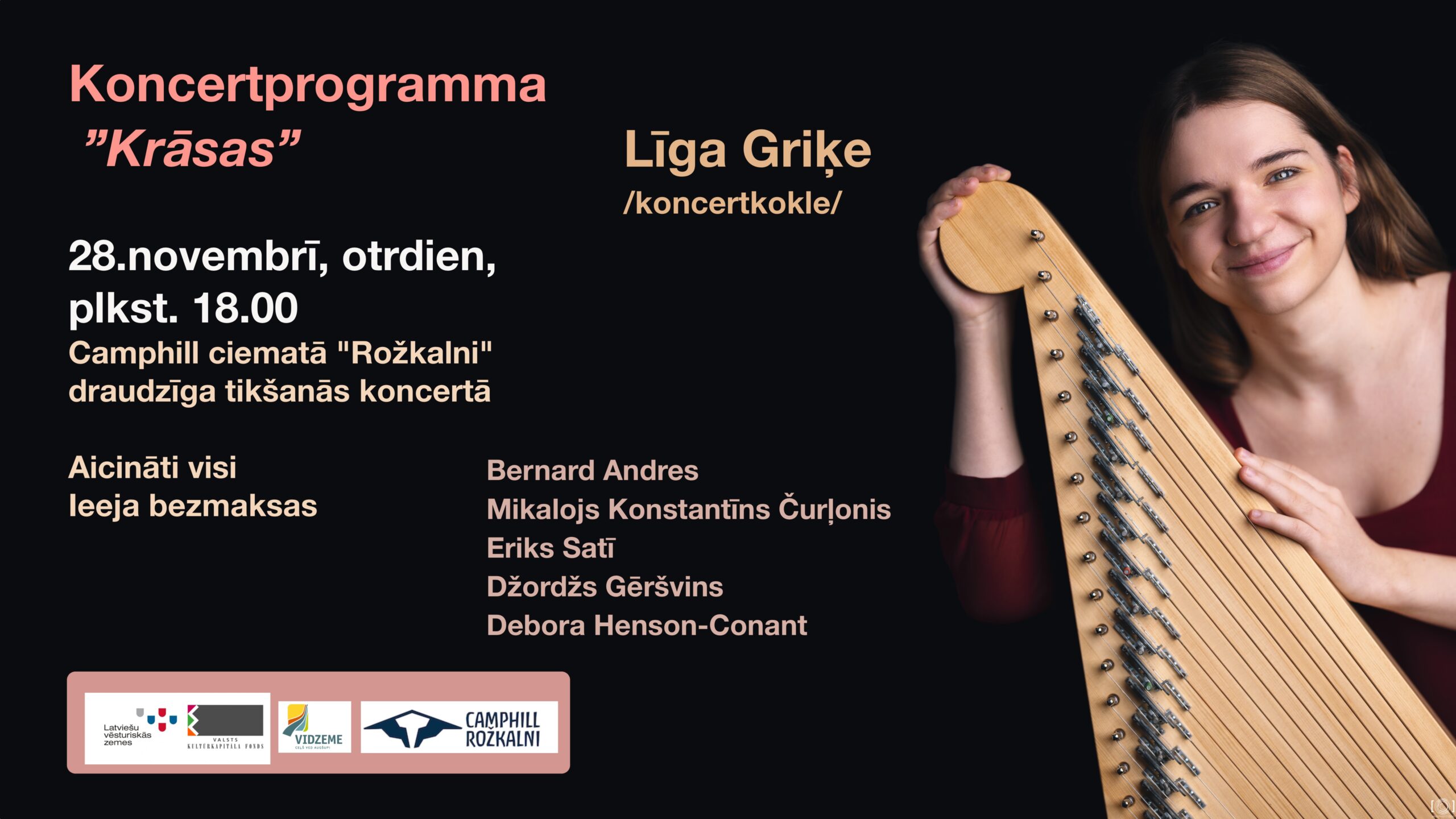 Otrdien, 28. novembrī, plkst. 18.00 Camphill ciematā “Rožkalni” draudzīga tikšanās koncertā. Muzicēs Līga Griķe /koncertkokle/. Programmā: Bernard Andres, Mikalojs Konstantīns Čurļonis, Eriks Satī, Džordžs Gēršvins, Debora Henson-Conant.