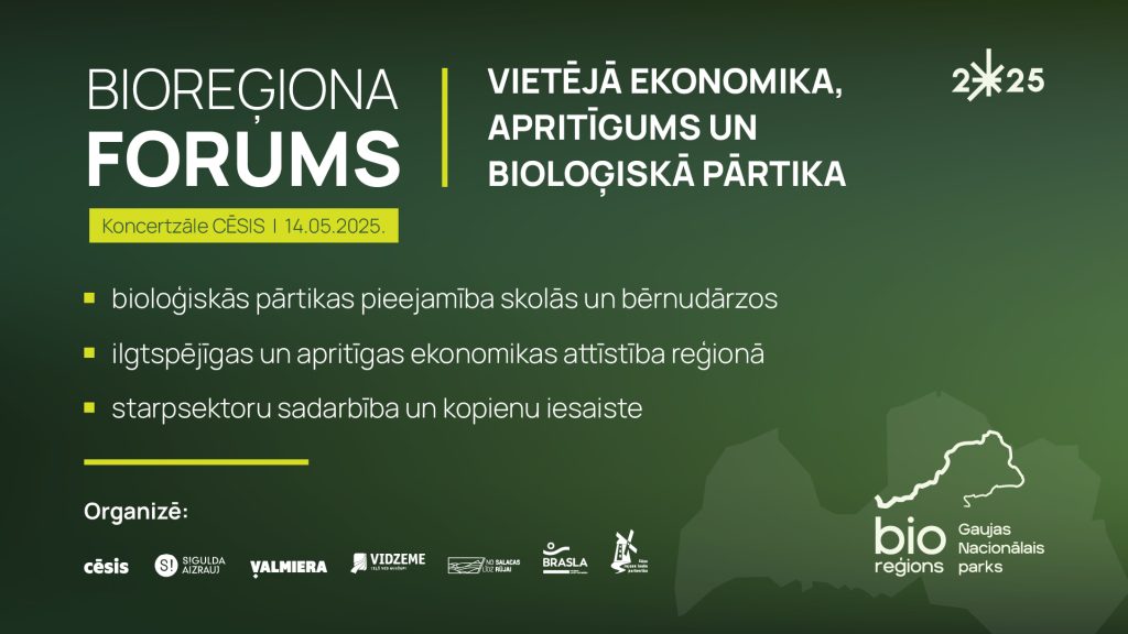 Aicinām piedalīties otrajā Bioreģiona forumā, kas notiks 14. maijā Vidzemes koncertzālē, Cēsīs. Šī gada foruma tēma – vietējā ekonomika, apritīgums un bioloģiskā pārtika.