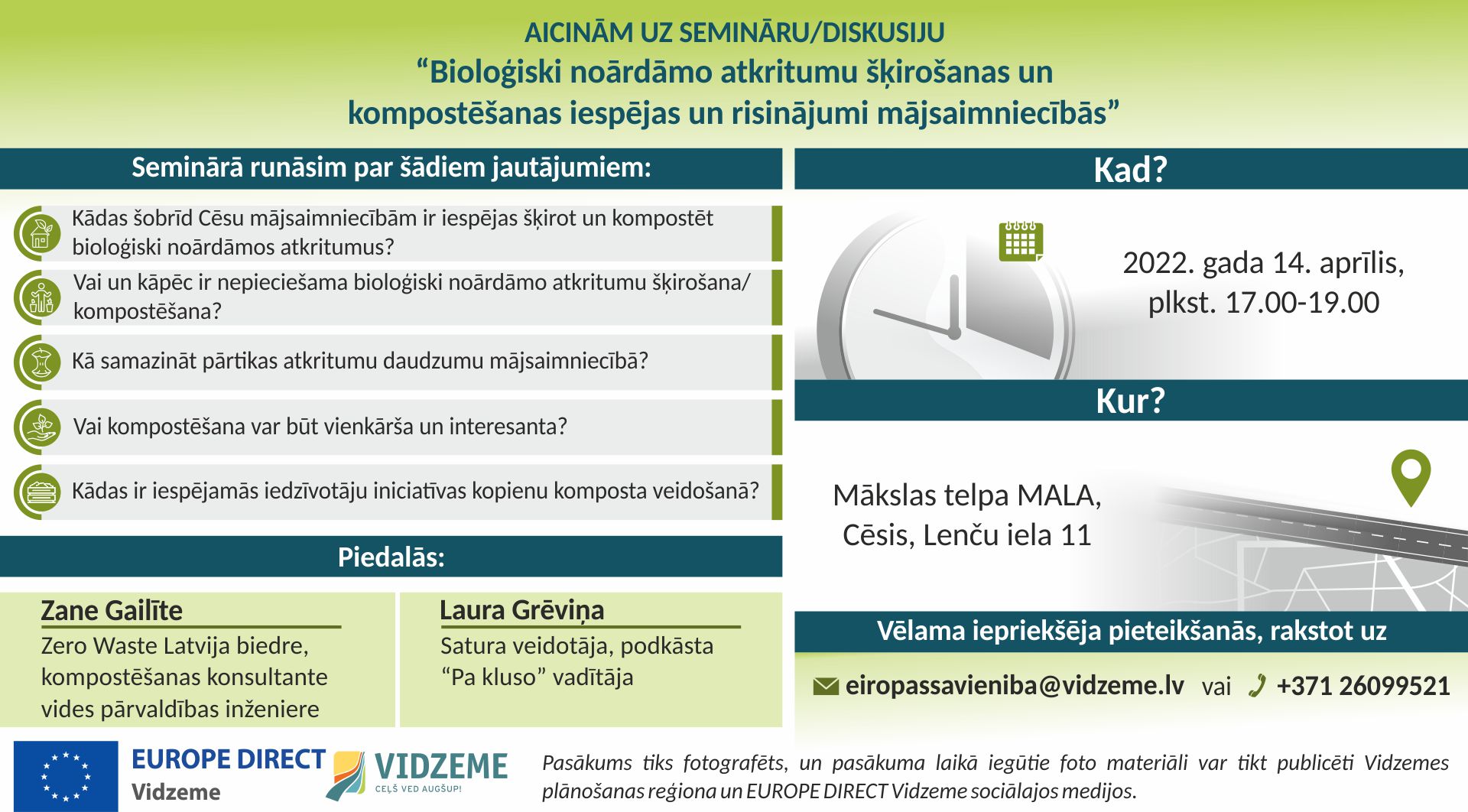 Lasīt vairākCēsīs norisināsies seminārs/diskusija “Bioloģiski noārdāmo atkritumu šķirošanas un kompostēšanas iespējas un risinājumi mājsaimniecībās”