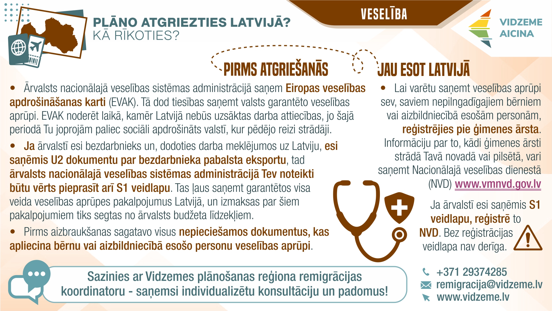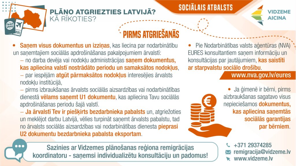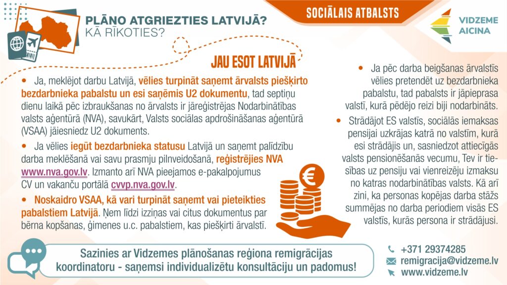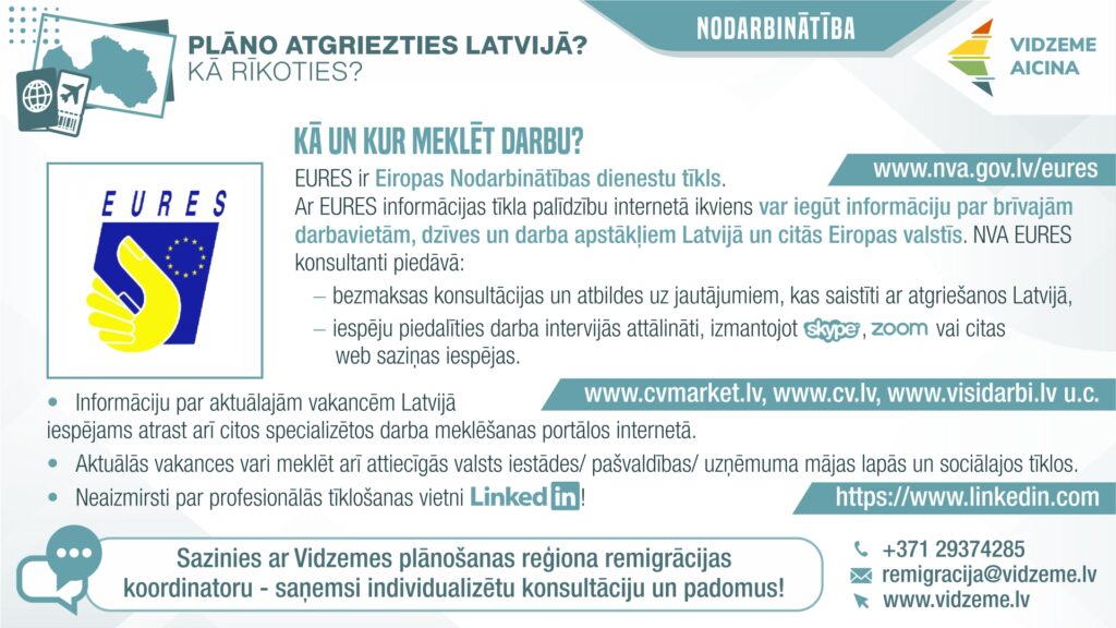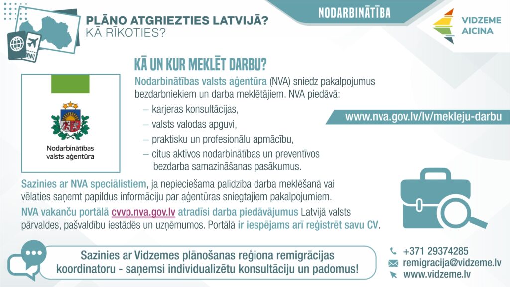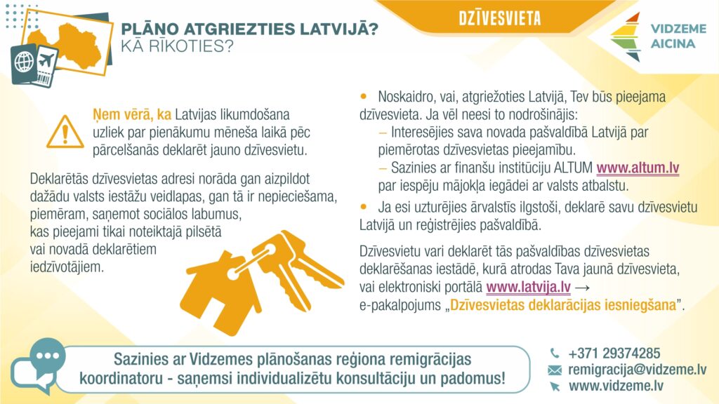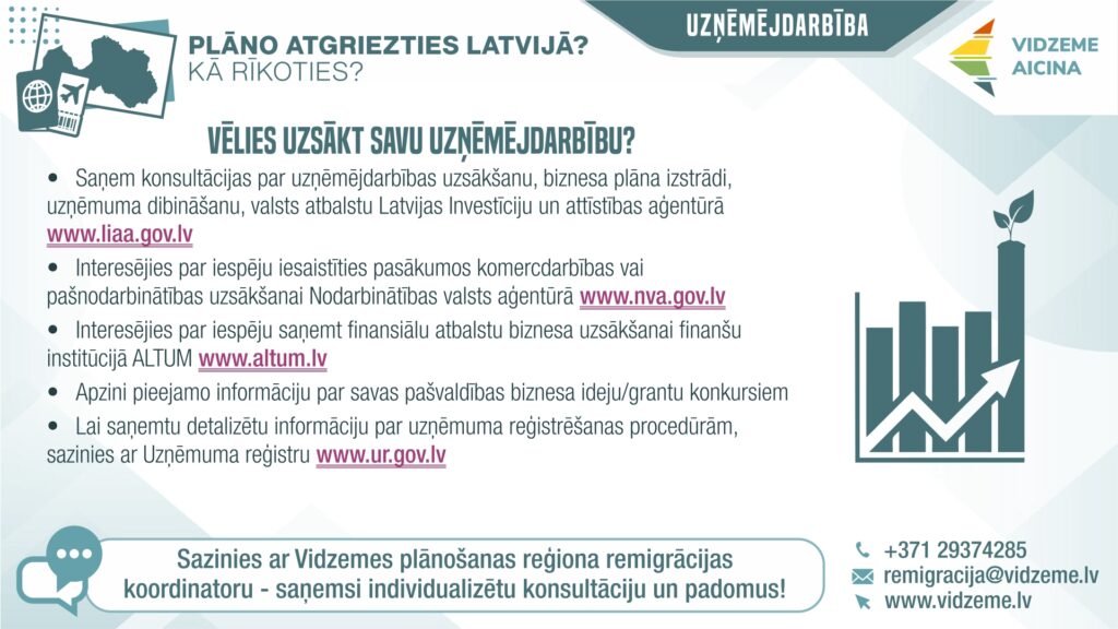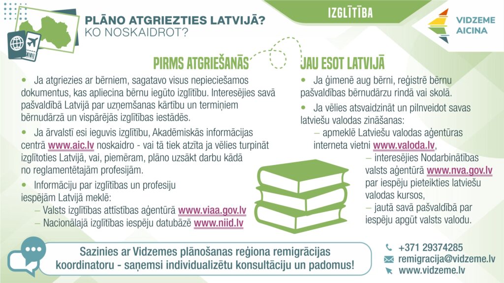 Gadījumā, ja šķiet, ka trūkst kāda būtiska informācija, aicinām sazināties ar remigrācijas koordinatori Vidzemē – Ingu Madžuli (remigracija@vidzeme.lv; mob.t. +371 29374285).