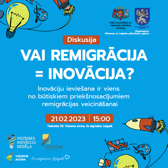 Vidzemes Inovāciju nedēļas 2023 ietvarā, 21. februārī, Vidzemes plānošanas reģions (VPR) un Latgales plānošanas reģions (LPR) organizēja tiešsaistes diskusiju “VAI REMIGRĀCIJA = INOVĀCIJA?”. Tajā piedalījās dažādu jomu eksperti, kuri saistīti ar remigrācijas procesiem Latvijā, kā arī remigranti-uzņēmēji, pētnieki. Diskusijas laikā tās dalībnieki vērtēja inovatīvu risinājumu ieviešanas ietekmi uz cilvēku vēlmi atgriezties no ārzemēm Latvijas reģionos.