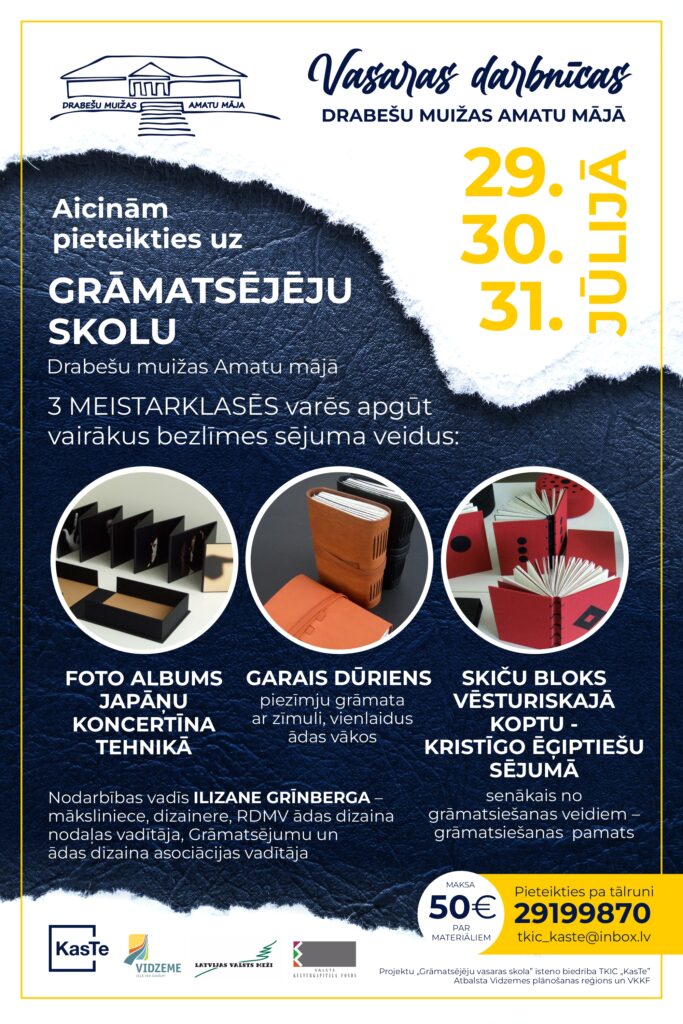 No 29. līdz 31. jūlijam Cēsu novada Drabešu muižas Amatu mājā tiks īstenots projekts „Grāmatsējēju skola”. Tā ietvaros tiks sarīkotas 3 meistarklases, kurās varēs apgūt vairākus grāmatu bezlīmes sējumu veidus.