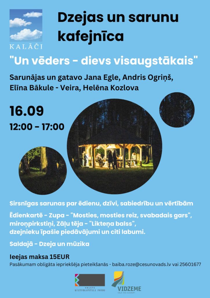 E. Veidenbauma muzejs “Kalāči” aicina uz otro projekta “Dzejas dienu tradīciju stiprināšana Cēsu novadā” notikumu – Dzejas un sarunu kafejnīca “Un vēders – dievs visaugstākais”. Dzejas un sarunu kafejnīca ir jauna, citāda formāta Dzejas dienu pasākums, kurš ir interesants gan apmeklētājiem, gan dzejniekiem. Pasākumā dzejnieki gatavo kādu no savām iecienītajām receptēm, aktiera Mārtiņa Liepas vadībā noris sarunas par ēdienu, dzīvi, vērtībām, sabiedrību, literatūru un saldajā tiek lasīta dzeja, muzicēts.