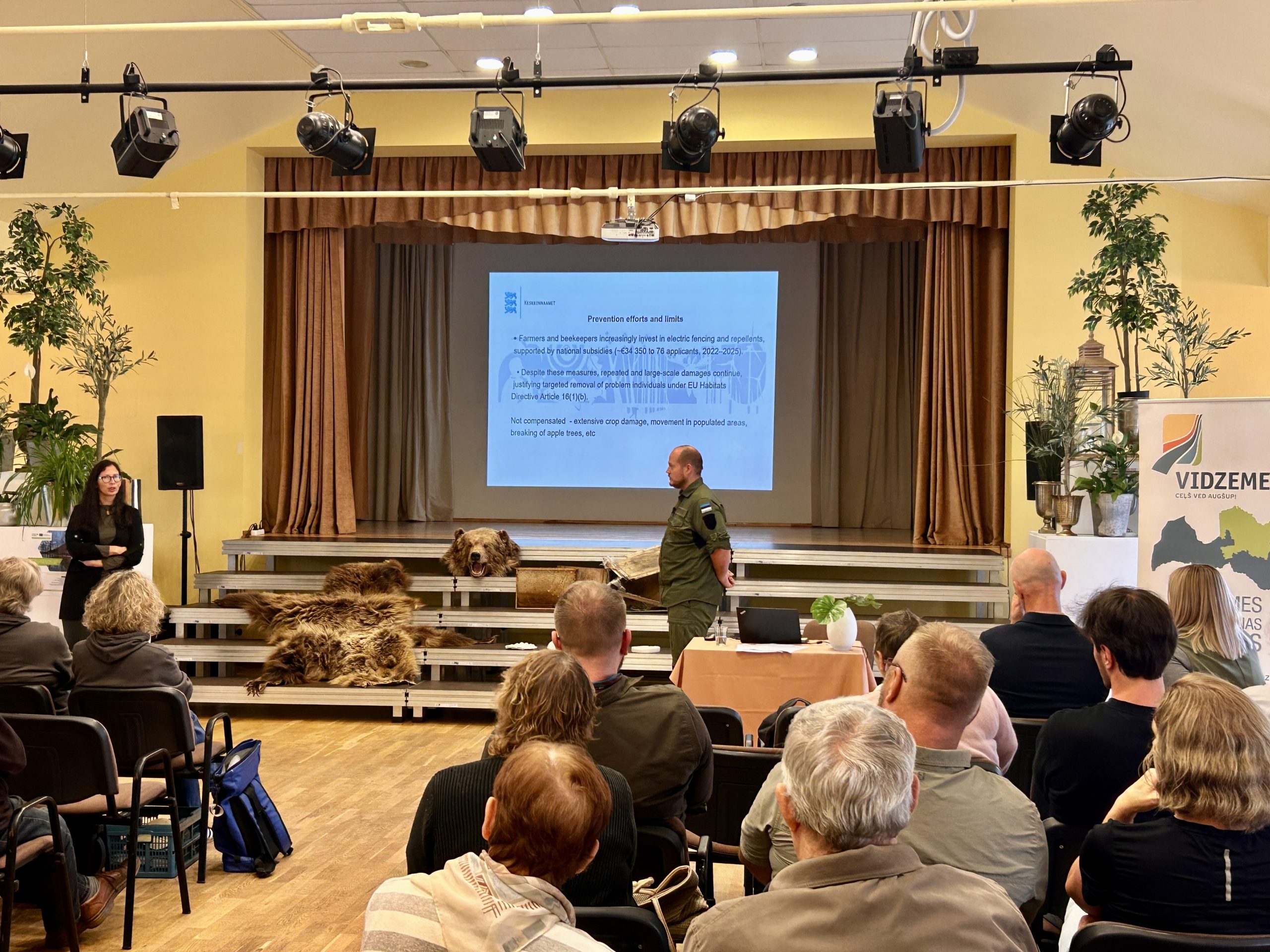 On 19th September 2025, the Vidzeme Planning Region organized a citizen engagement event in Kārķi, bringing together experts from the Nature Conservation Agency, the Latvian State Forest Research Institute “Silava”, and the Environmental Board of Estonia (Keskkonnaamet) – Latvia’s closest neighbours, where the brown bear population is almost six times larger.