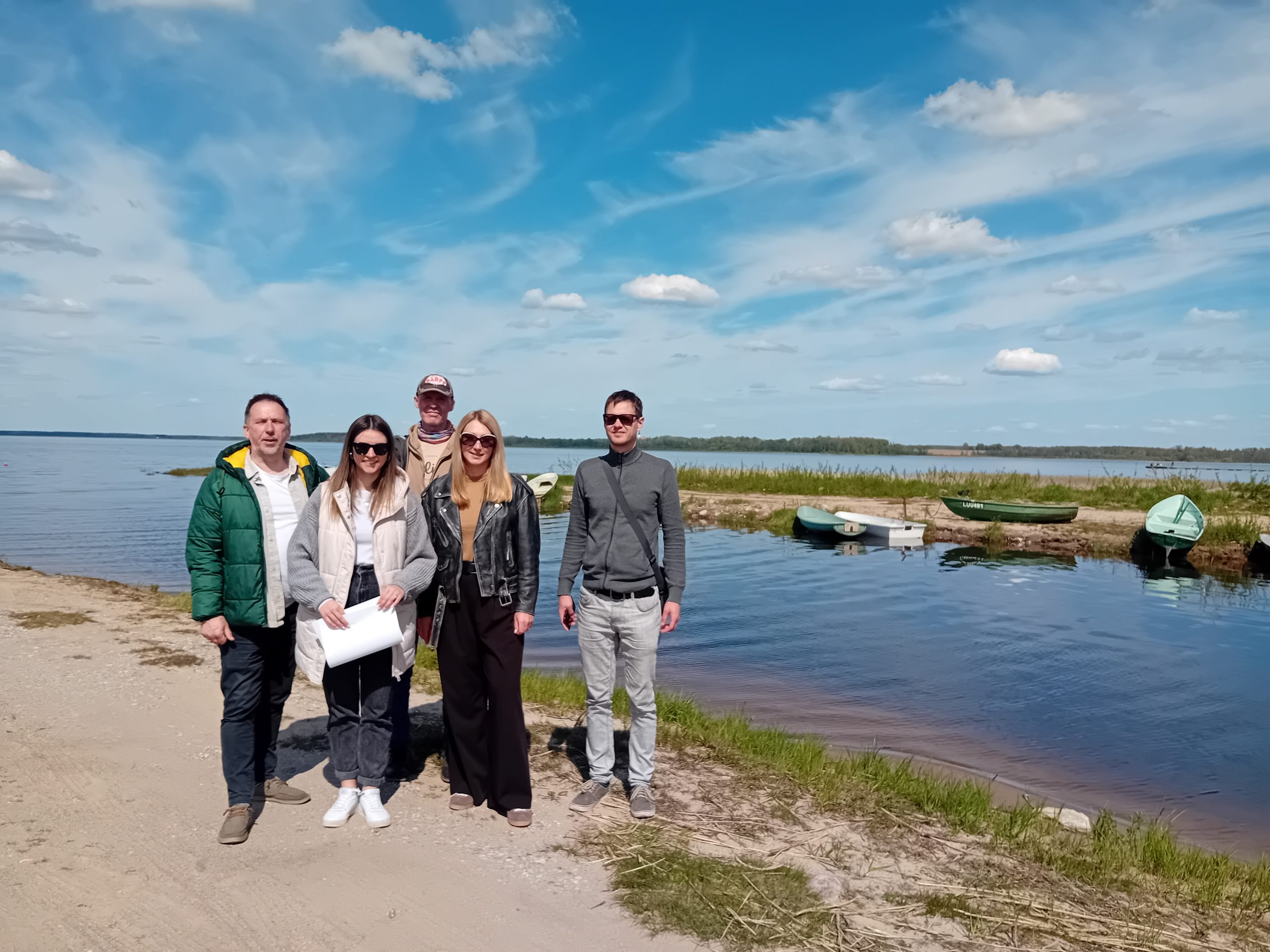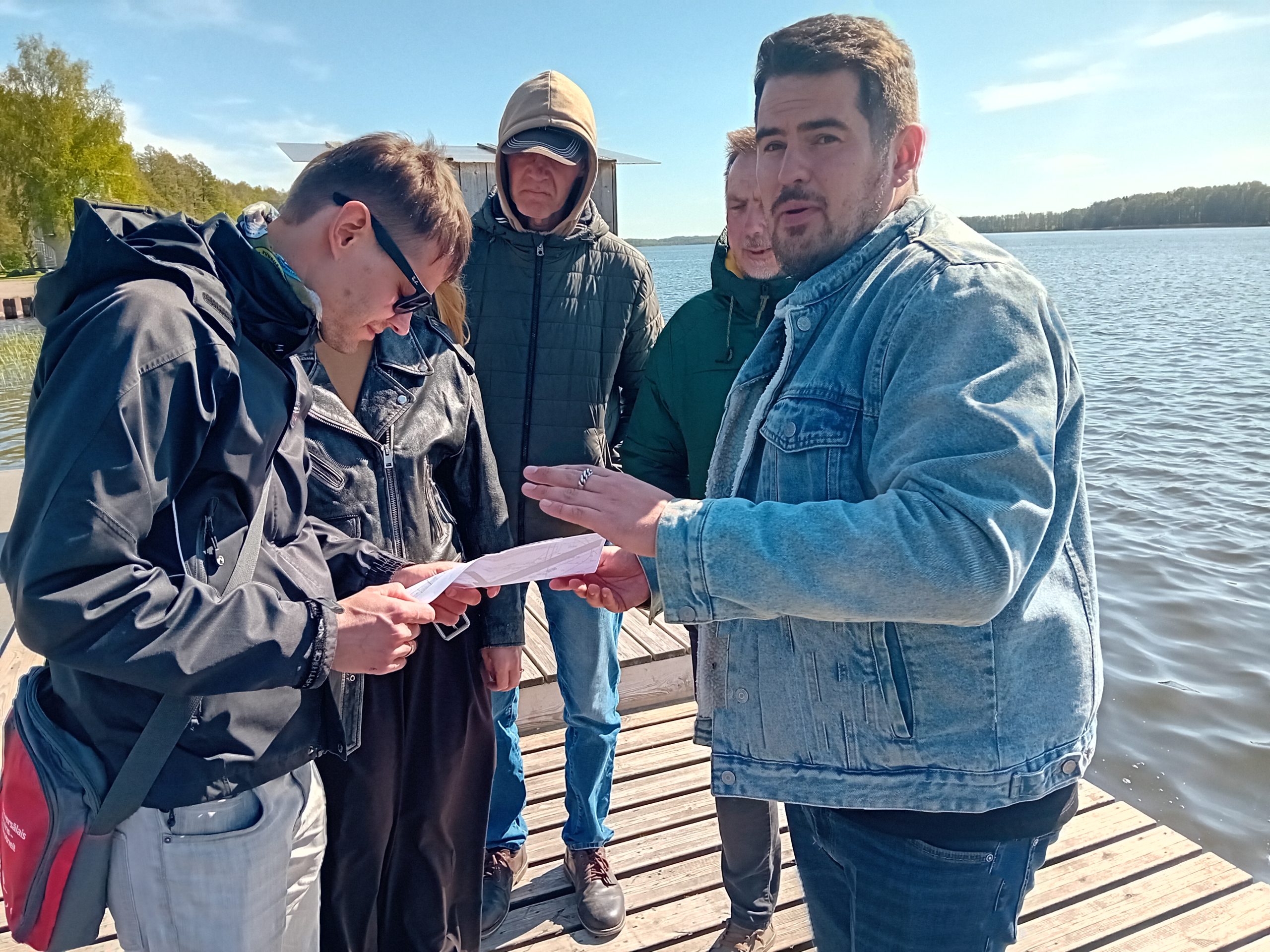 During the survey, representatives from the municipality and specialists from “Apeirons” discussed the best location for the pontoon footbridge to be built. This decision must be made thoughtfully and responsibly, as various aspects must be weighed. For example, a river flows into the lake, which forms a stream along the shore. There is a depression in the lake bed in that place. It is also necessary to consider making the new footbridge both convenient and easily accessible from the shore while ensuring it remains safe. It is planned that both swimmers and boaters will use the area, so the selected location must be suitable for both activities.