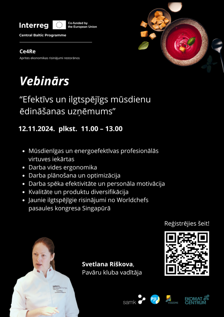 On November 12, 2024, from 11:00 AM to 1:00 PM, a free webinar will take place, intended for catering businesses and professionals. The webinar is organized as part of the Interreg Central Baltic Ce4Re project, aimed at promoting sustainability and resource-efficient practices in the restaurant industry.