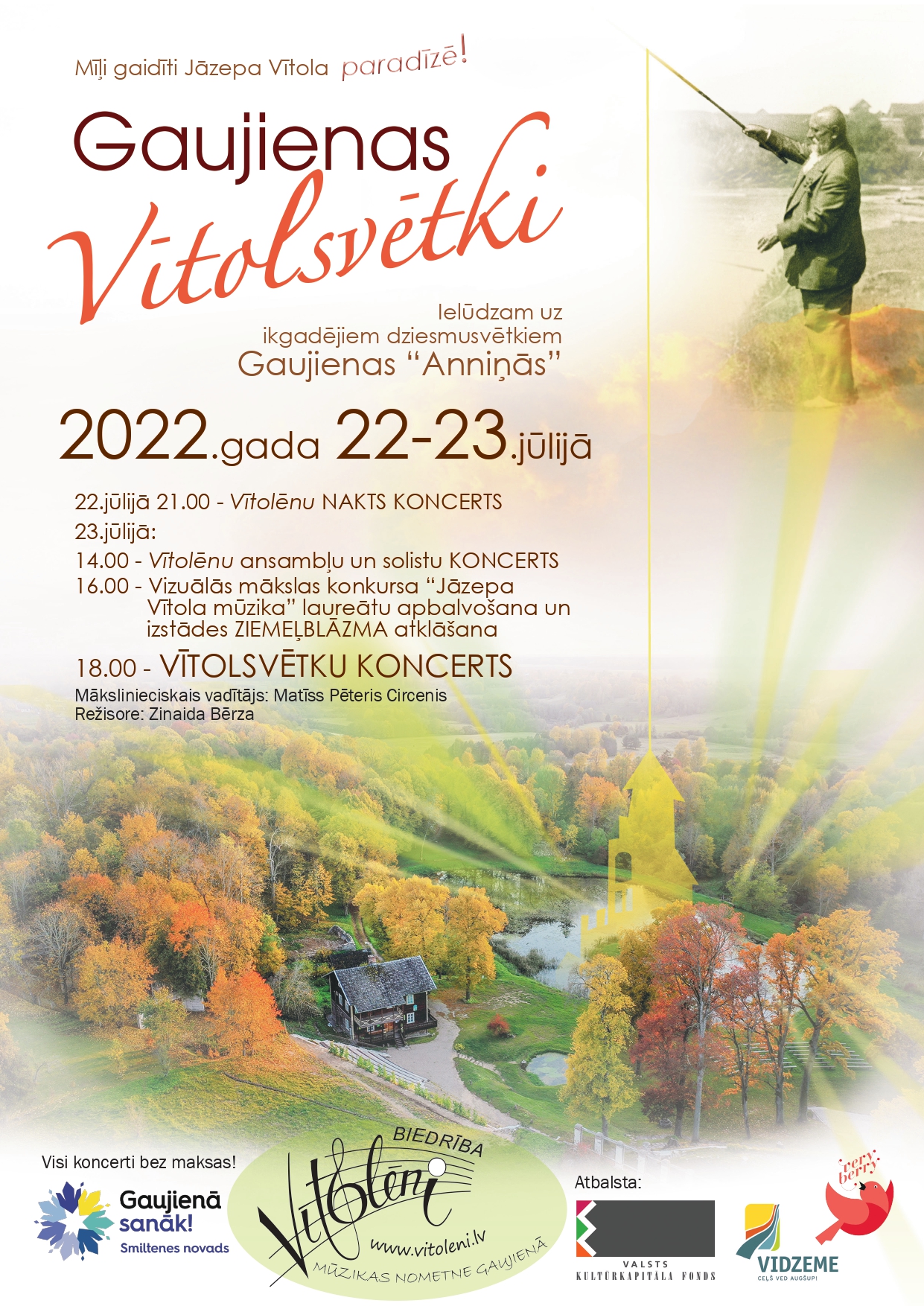 Ikviens mīļi gaidīts Gaujienas Vītolsvētku koncertos 22. un 23. jūlijā! Ar VKKF atbalstu Vītolsvētku īpašie viesi – jauniešu koris “Kamēr….”, kuri uzstāsies ar savu programmu, kā arī vienosies kopīgā korī ar radošā mūzikas nometne “Vītolēni” kori un Latvijas amatierkoriem. Bet nometnes “Vītolēni” bērnu kora un orķestra izpildījumā skanēs komponista un diriģenta Andra Riekstiņa “Kā es braucu Ziemeļmeitas lūkoties” pirmatskaņojums.