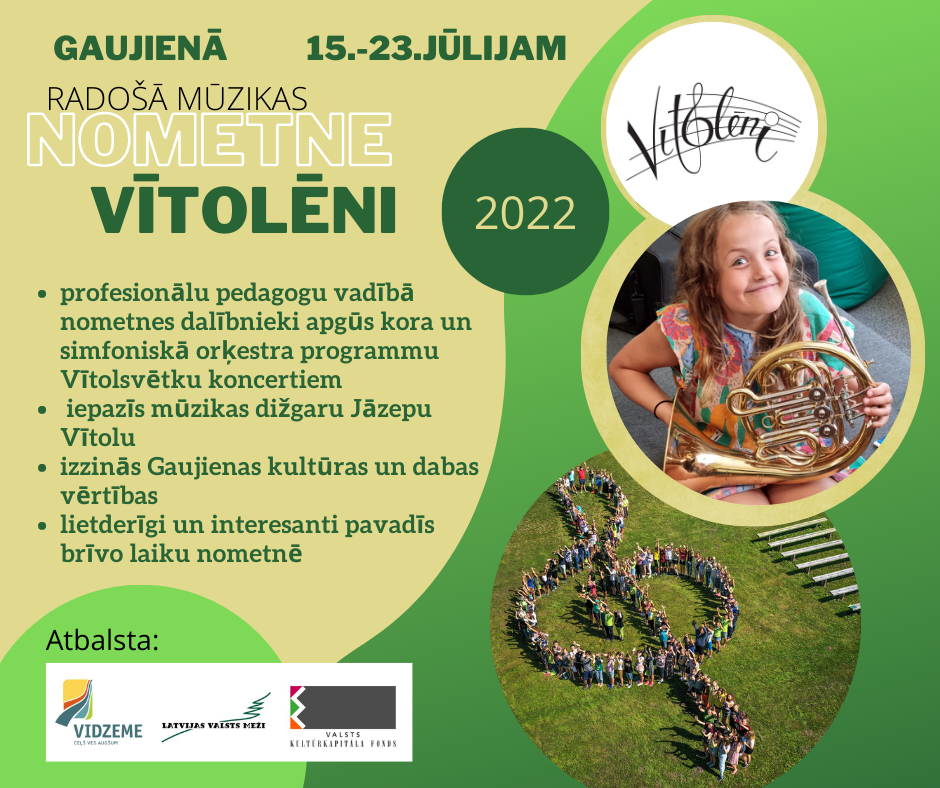 No 15. jūlija līdz 23. jūlijam jau 19. reizi Gaujienā notiks radošā mūzikas nometne “Vītolēni”. Tā notiek kopš 2003. gada, izņemot 2020. gadu, kad epidemioloģiskie apstākļi neļāva organizēt nometni, kurā piedalītos 150 dalībnieki. Nometnes mērķi un uzdevumi paliek nemainīgi – bērni un jaunieši apgūs kora un simfoniskā orķestra programmu Vītolsvētku koncertiem, iepazīs mūzikas dižgaru Jāzepu Vītolu, Gaujienas kultūras un dabas vērtības.