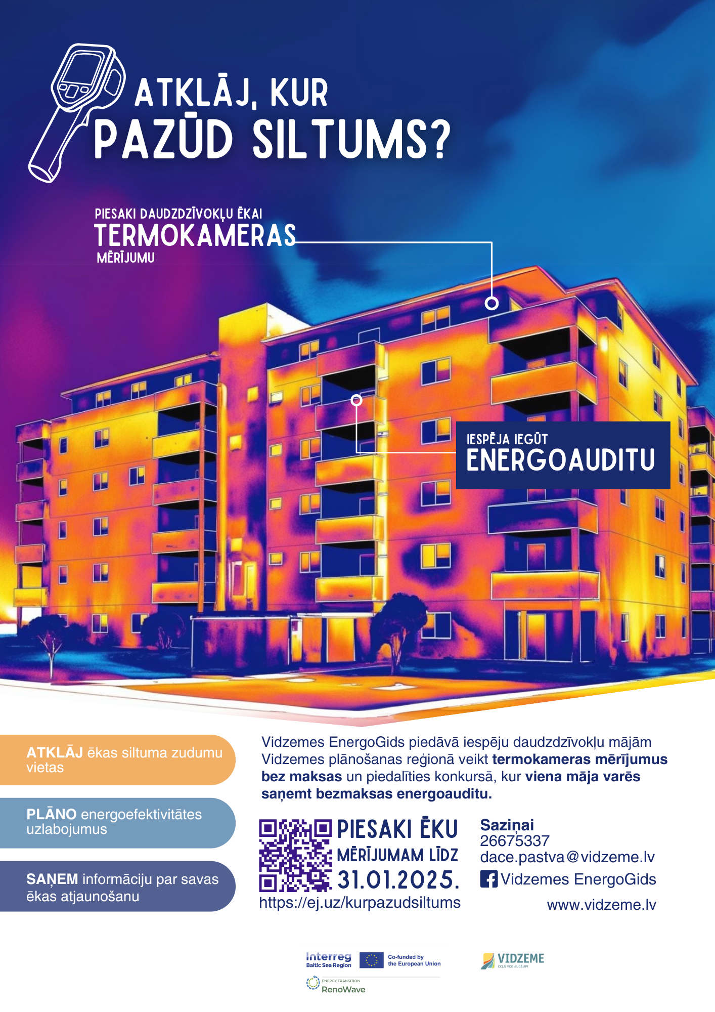 Vidzemes plānošanas reģions un informatīvais atbalsta punkts par daudzdzīvokļu ēku atjaunošanu Vidzemes EnergoGids aicina reģiona iedzīvotājus piedalīties bezmaksas termokameras mērījumu kampaņā, lai identificētu daudzdzīvokļu ēku siltuma zudumu vietas un veicinātu namu energoefektivitāti.