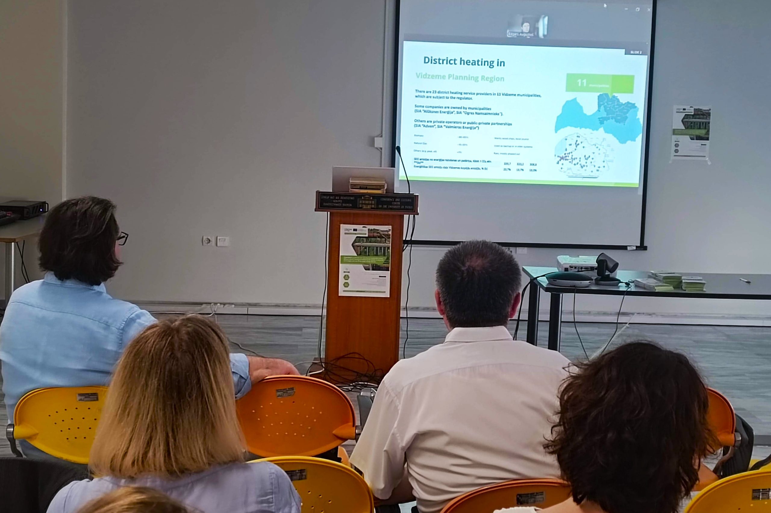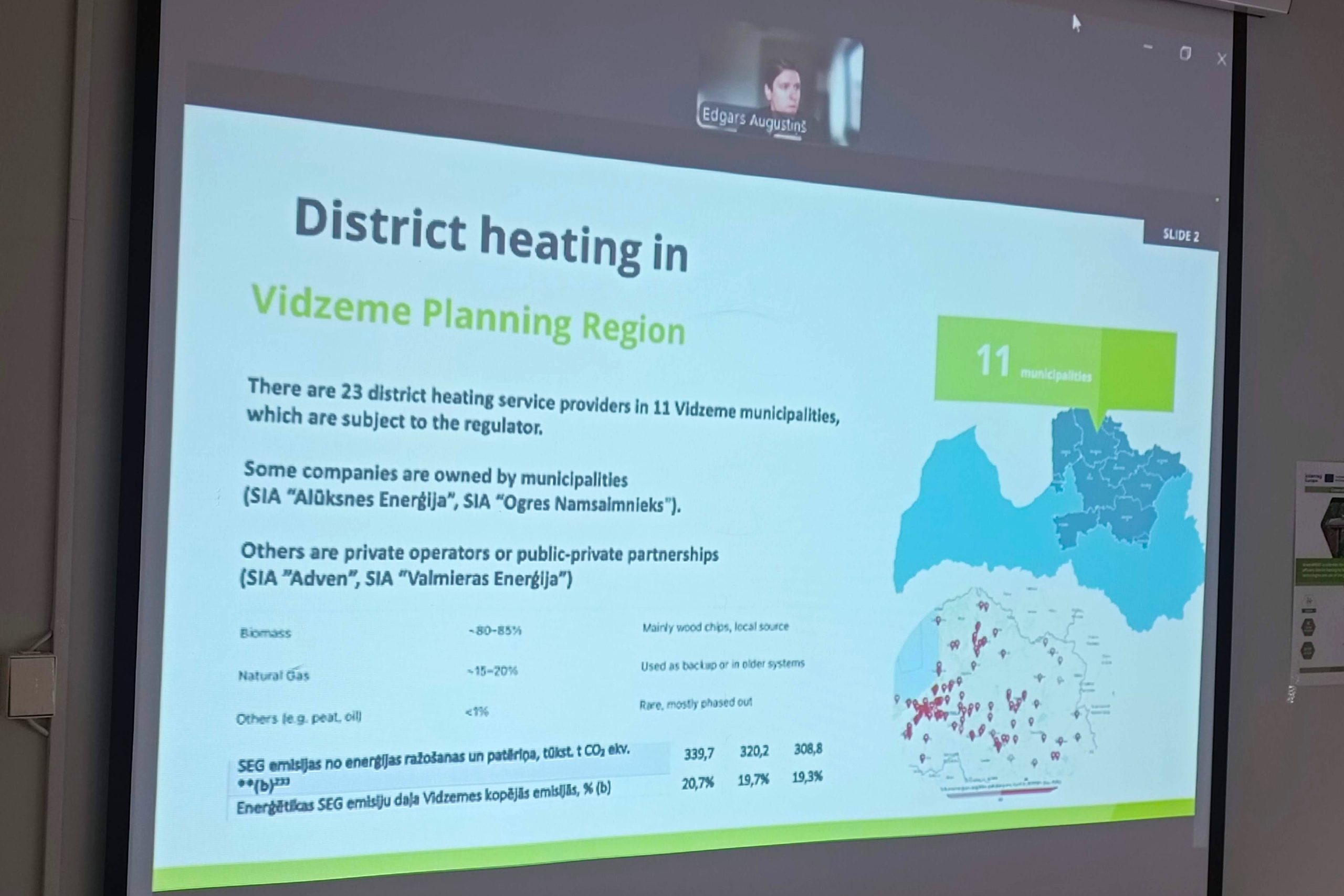 Vidzemes plānošanas reģiona pārstāvis Edgars Augustiņš iepazīstināja partnerus ar centralizētās siltumapgādes situāciju Vidzemē. Reģionā darbojas 23 siltumapgādes uzņēmumi 11 pašvaldībās, taču nozarē pastāv būtiskas problēmas: siltumtīklu nolietojums, siltuma zudumi līdz pat 30%, investīciju trūkums un nepietiekamā plānošanas kapacitāte. Kā vienu no iespējamajiem risinājumiem E. Augustiņš minēja digitālās uzskaites ieviešanu un kopīgu tehnisko risinājumu attīstīšanu, kas veicinātu efektīvāku resursu izmantošanu.