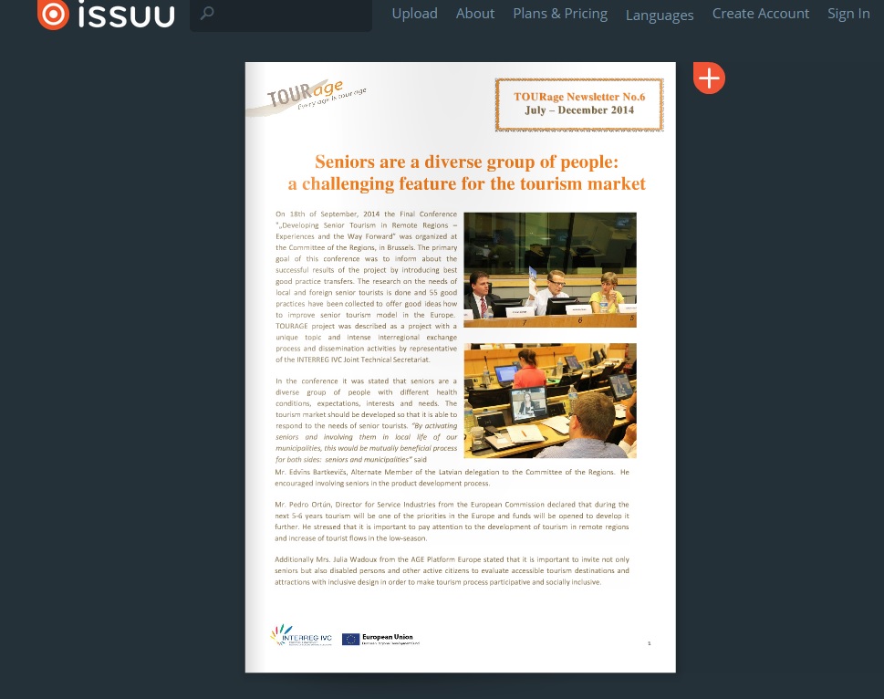 Novembrī iznākusi projekta TOURAGE pēdējā ziņu lapa angļu valodā. Īsi pirms projekta noslēguma, projekta komanda īstenojusi vairākas aktivitātes gan reģionos, gan arī projektā kopumā. Projekta pārstāvji vairākkārt aicināti doties uz dažādām starptautiskām konferencēm, lai stāstītu par projekta laikā sasniegtajiem rezultātiem. Veiksmīgi norisinājās arī paša projekta TOURAGE organizētā konference Briselē, kas pulcēja vairāk kā 100 dalībniekus. Noslēguma konferencē Briselē tika gūts apstiprinājums, ka arī turpmāk daļa finanšu līdzekļu Eiropas Savienībā tiks iezīmēti tūrisma attīstībai un ka seniori ir nozīmīga mērķgrupas daļa tūrismā.