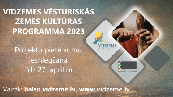 Vidzemes plānošanas reģions (turpmāk – VPR) izsludina Valsts kultūrkapitāla fonda mērķprogrammas projektu konkursu “Vidzemes vēsturiskās zemes kultūras programma 2023”. Tā mērķis ir veicināt kvalitatīvu un daudzveidīgu kultūras piedāvājuma pieejamību sabiedrībai un jaunradi Vidzemes vēsturiskajā zemē, kā arī Vidzemes vēsturiskās zemes kultūras daudzveidības saglabāšanu un attīstību. Konkursā kopējais pieejamais finansējums būs 172 050,00 eiro. Vienam projektam pieprasītais finansējums nedrīkst pārsniegt 5% no “Vidzemes vēsturiskās zemes kultūras programmas 2023” projektu konkursā pieejamā finansējuma. Projektu pieteikumus pieņems līdz 27. aprīlim.