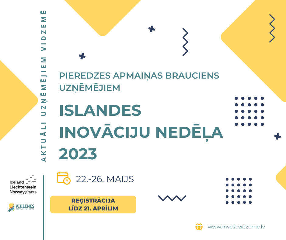 No šī gada 22. līdz 26. maijam Vidzemes plānošanas reģions (VPR) aicina uzņēmējus piedalīties pieredzes apmaiņas braucienā uz Islandi, lai iepazītu Islandes inovāciju nedēļu 2023 (Iceland Inovation Week 2023). Tās ietvaros norisināsies pasākumi uzņēmumiem, kam saistoša aprites ekonomikas joma, jo īpaši – pārtikas, enerģētikas un veselības tehnoloģijas, kā arī zilās bioekonomikas tehnoloģijas. Tāpat paredzēts, ka programmas saturs būs atbilstošs augsto tehnoloģiju attīstītājiem, t.sk. finanšu sfērā. Aicinām pieteikumus dalībai sūtīt līdz 2023. gada 21. aprīlim, aizpildot anketu šeit: https://forms.gle/TWAXqcpnnb6L5QLb8.