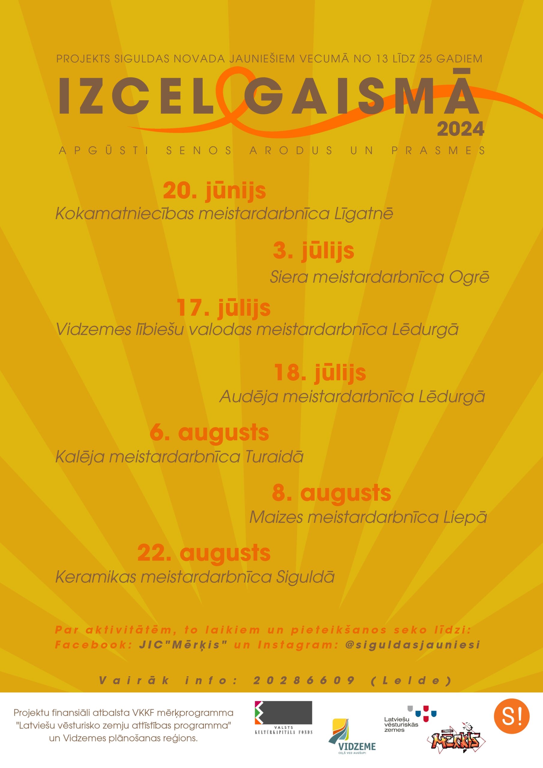 Projekta “Izcel gaismā” ietvaros jauniešiem tiks piedāvāta iespēja piedalīties septiņās dažādās meistardarbnīcās: keramikas, kokamatniecības, kalēja, maizes cepšanas, Jāņu siera siešanas, aušanas un Vidzemes lībiešu valodas apguves meistardarbnīcā.