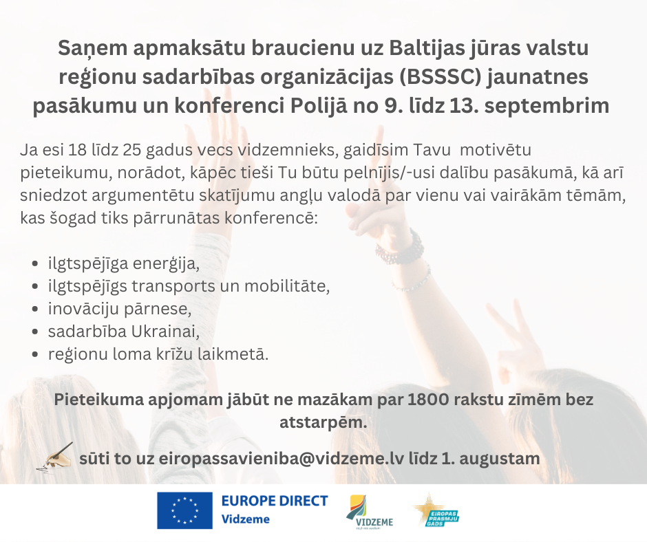 Vidzemes plānošanas reģions jau vairākus gadus pārstāv Vidzemi Baltijas jūras valstu reģionu sadarbības organizācijā (BSSSC), kur tas ne tikai vada Inovāciju pārneses darba grupu, bet arī aktīvi līdzdarbojas jauniešu iesaistes jautājumos. Tādēļ aicinām reģiona jauniešus, vecumā no 18 līdz 25 gadiem, piedalīties BSSSC jauniešu pasākumā, kas notiks no 9. līdz 13. septembrim Polijā, Ščečinā. Piedaloties pasākumā, tiek nodrošināta dalība arī BSSSC ikgadējā konferencē (https://www.bsssc.com/). Dalībnieki tiks atlasīti konkursa kārtībā, balstoties motivētos pieteikumos dalībai pasākumā. Jauniešiem tiks segtas ceļošanas un uzturēšanās izmaksas.