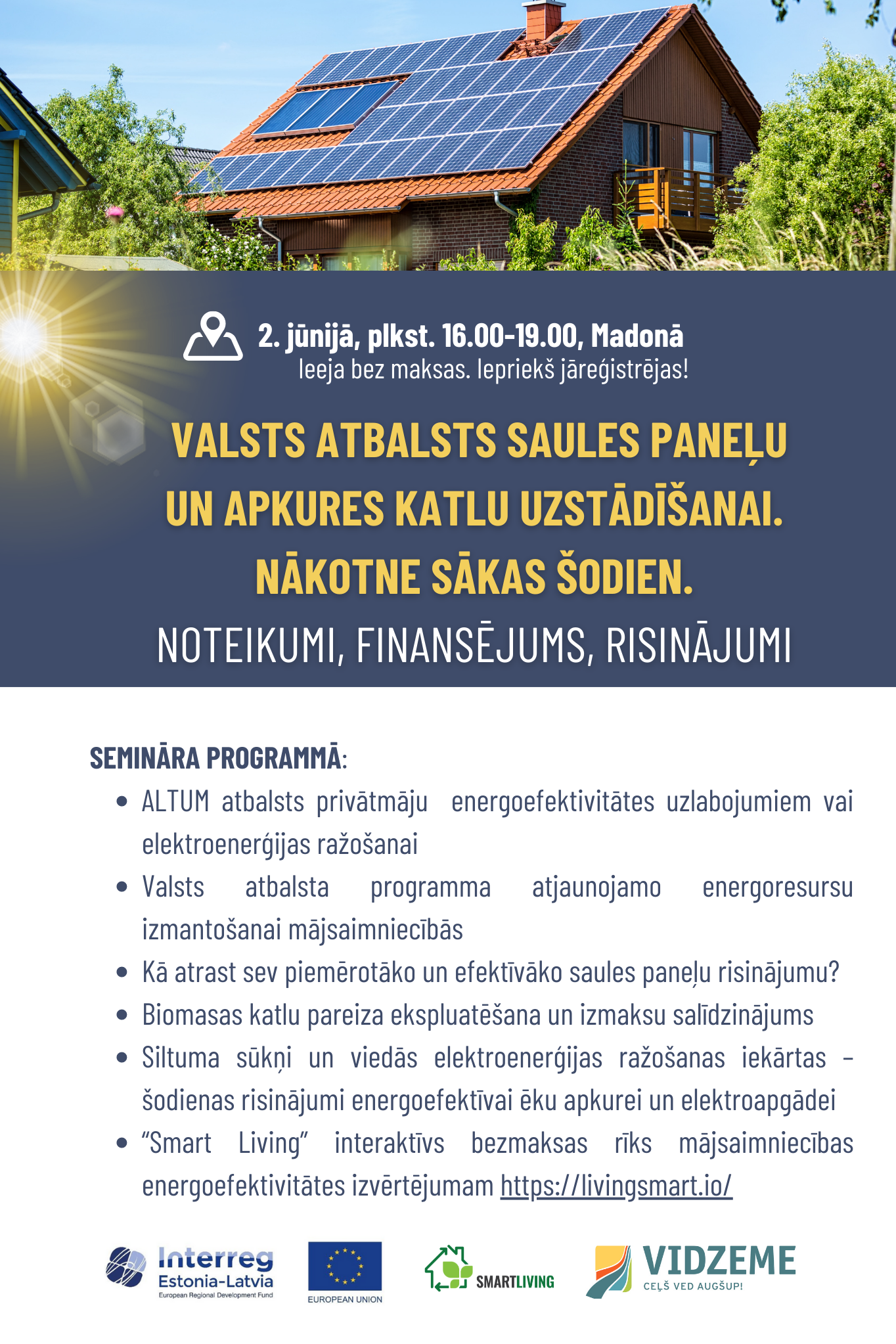 Ceturtdien, 2. jūnijā, plkst. 16.00, Madonā (Saieta laukumā 1, Madonas novada pašvaldības domes ēkas 3. stāva zālē) Vidzemes plānošanas reģions organizē bezmaksas semināru “Valsts atbalsts saules paneļu un apkures katlu uzstādīšanai. Nākotne sākas šodien. Noteikumi, finansējums, risinājumi.”