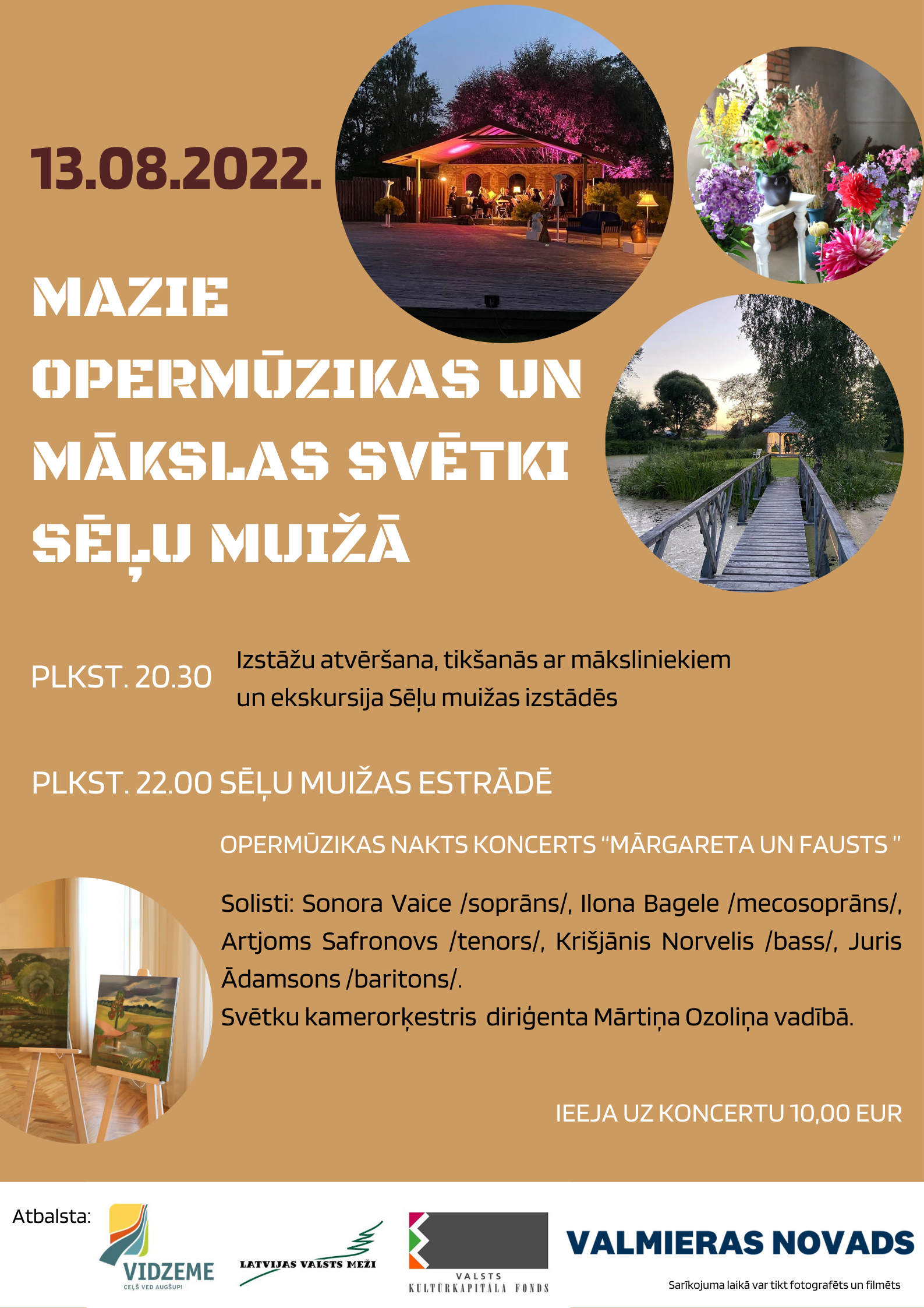 Sestdien, 13. augustā, Valmieras novada Sēļu muižā jau devīto gadu notiks Mazie Opermūzikas un Mākslas svētki, kuru ietvaros tiks realizēts Vidzemes plānošanas reģiona, Latvijas valsts mežu, Valsts kultūrkapitāla fonda atbalstītās Vidzemes kultūras programmas projekts “MARGARĒTA UN FAUSTS – Opermūzikas nakts koncerts Sēļu muižā”.