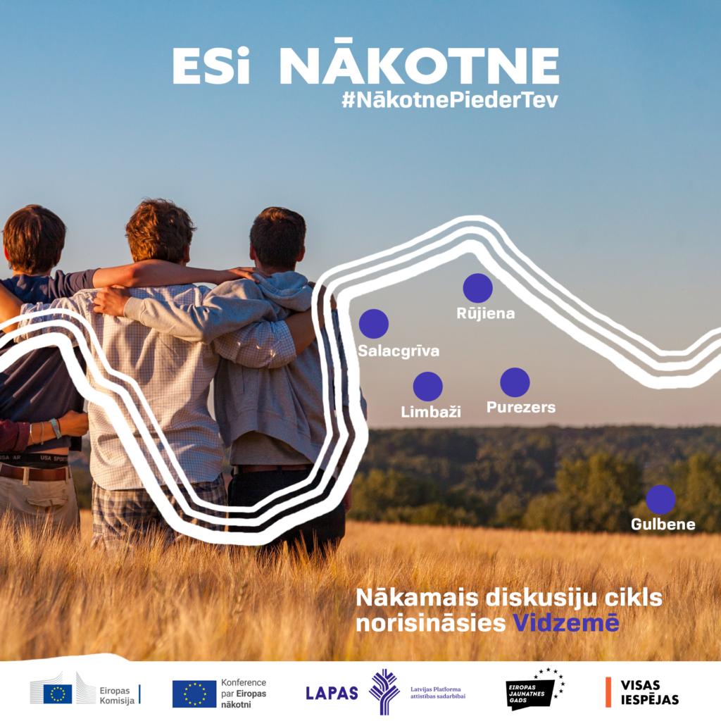 No šī gada 18. līdz 20. martam Latvijas Platforma attīstības sadarbībai (LAPAS) ar domubiedriem un ar Eiropas Komisijas pārstāvniecības Latvijā atbalstu viesosies Vidzemē ar piecām diskusijām ciklā “ESi NĀKOTNE”, kurās aicinās dalībniekus dalīties ar savu vīziju par Eiropu un savu lomu nākotnes Eiropā. 18. martā plkst. 16.00 aicinām uz sarunu Limbažos, Burtnieku ielas kvartālā; 19. martā plkst. 11.00 Salacgrīvā, Jaunatnes un uzņēmējdarbības iniciatīvu centrs “BĀKA”; 19. martā plkst. 14.30 Purezerā, Purezera dabas takā; 20. martā plkst. 11.00 Gulbenē, Gulbenes novada jauniešu centrā “Bāze” un 20. martā plkst. 16.00 Rūjienā, Rūjienas Multifunkcionālajā jaunatnes iniciatīvu centrā.