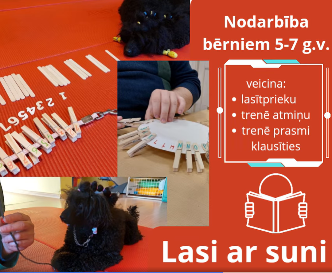 Nodarbības laikā bērni kopā ar Sabīni lasīs grāmatu, tad sekos radoša darbošanās kopā ar kanisterapijas suņiem. Nodarbība veicina bērna lasītprieku, trenē atmiņu un prasmi klausīties.