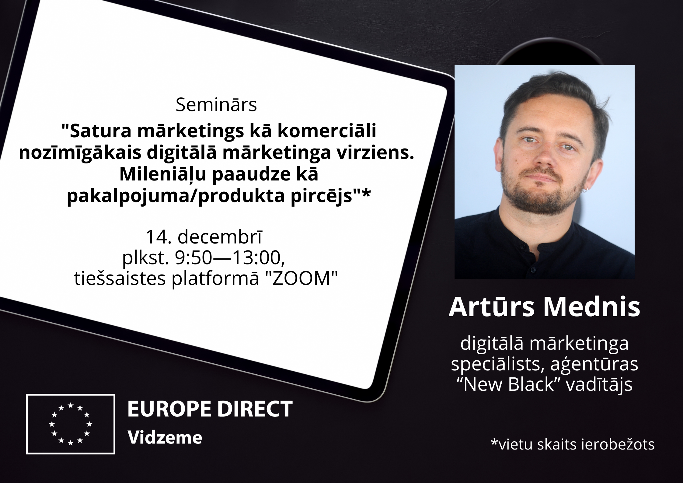 EUROPE DIRECT Vidzeme aicina tūrisma un viesmīlības nozares uzņēmumus un citus interesentus piedalīties seminārā “Satura mārketings kā komerciāli nozīmīgākais digitālā mārketinga virziens. Mileniāļu paaudze kā pakalpojuma/produkta pircējs”, kas notiks 14. decembrī plkst.9.50–13:00, tiešsaistes platformā ZOOM. Lekcijas vadīs Artūrs Mednis, digitālā mārketinga speciālists, aģentūras “New Black” vadītājs.