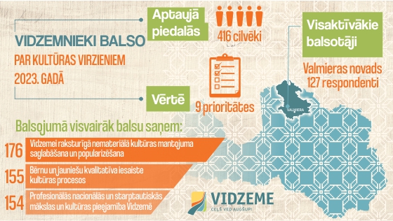 Gandrīz mēnesi ilgušajā aptaujā vidzemnieki varēja izteikt savas domas, tiešsaistē aizpildot aptaujas anketu. Katrs varēja balsot par to, kas, viņaprāt, būtu svarīgs kultūras jomā Vidzemē 2023. gadā. Ja finansējums Vidzemes kultūras programmas īstenošanai tiks piešķirts un VPR būs tās īstenotājs, kā arī, ja programmas nosacījumi netiks mainīti, tad trīs vislielāko atbalstu saņēmušās jomas tiks iekļautas konkursa nolikumā.