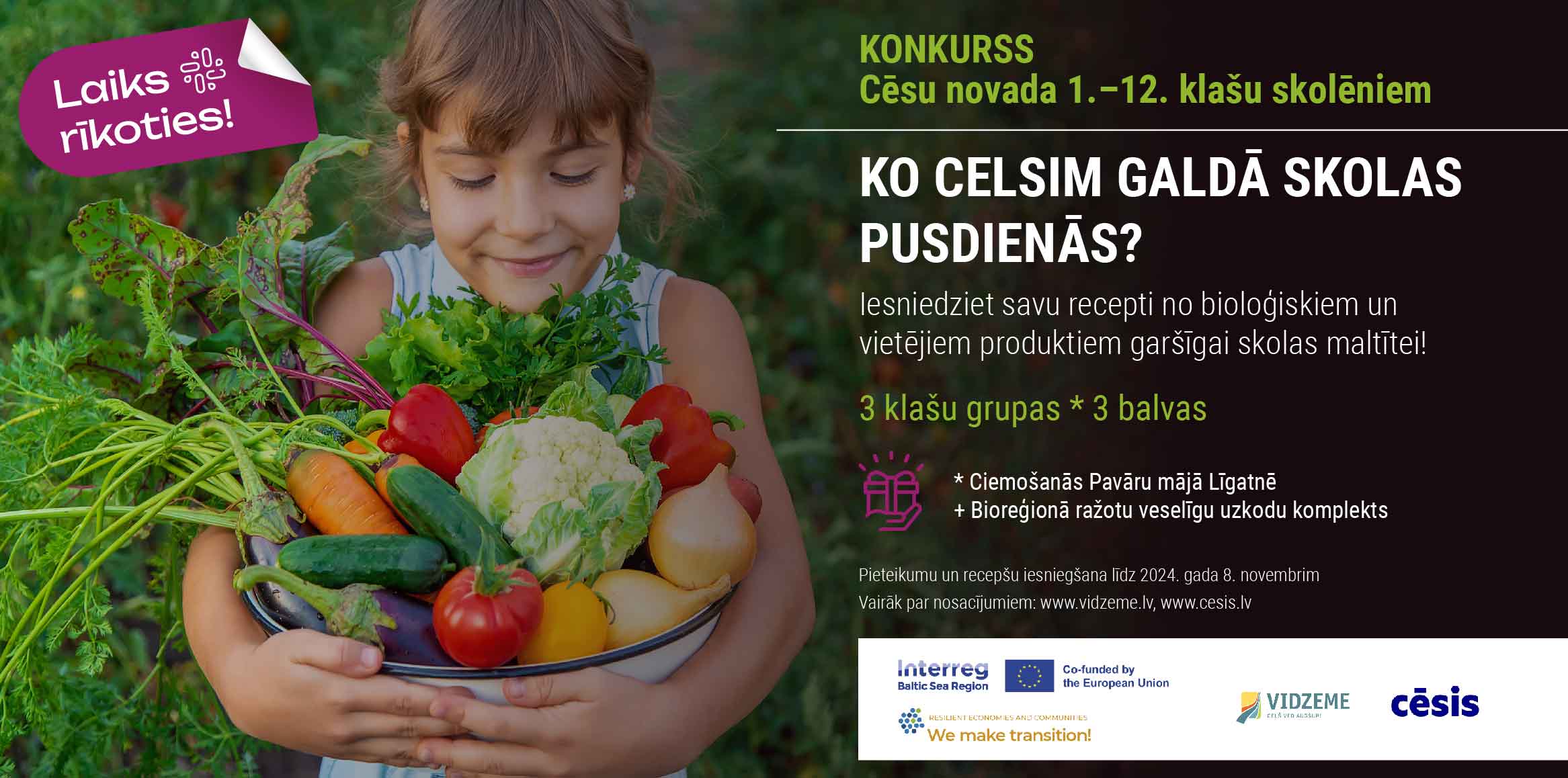 Konkursu “Ko celsim galdā skolas pusdienās?” organizē Vidzemes plānošanas reģions sadarbībā ar Cēsu novada pašvaldību un aicina Cēsu novada vispārizglītojošo skolu 1. līdz 12. klašu skolēnus, skolotājus un skolu pavārus veidot komandas un sagatavot recepti skolas pusdienu ēdienam, izmantojot bioreģionā Vidzemē audzētos un ražotos produktus.