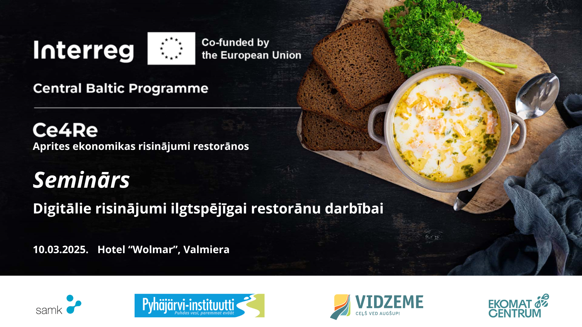 Seminārs tiek organizēts Interreg Centrālā Baltijas jūras reģiona pārrobežu sadarbības programmas 2021.-2027. gadam projekta “Ce4Re” ietvaros. Tā mērķis ir veicināt aprites ekonomikas principu ieviešanu restorānu nozarē, palīdzot uzņēmumiem optimizēt resursu izmantošanu un samazināt ietekmi uz vidi. Projekts tiek īstenots sadarbībā ar partneriem no Latvijas, Somijas un Zviedrijas.