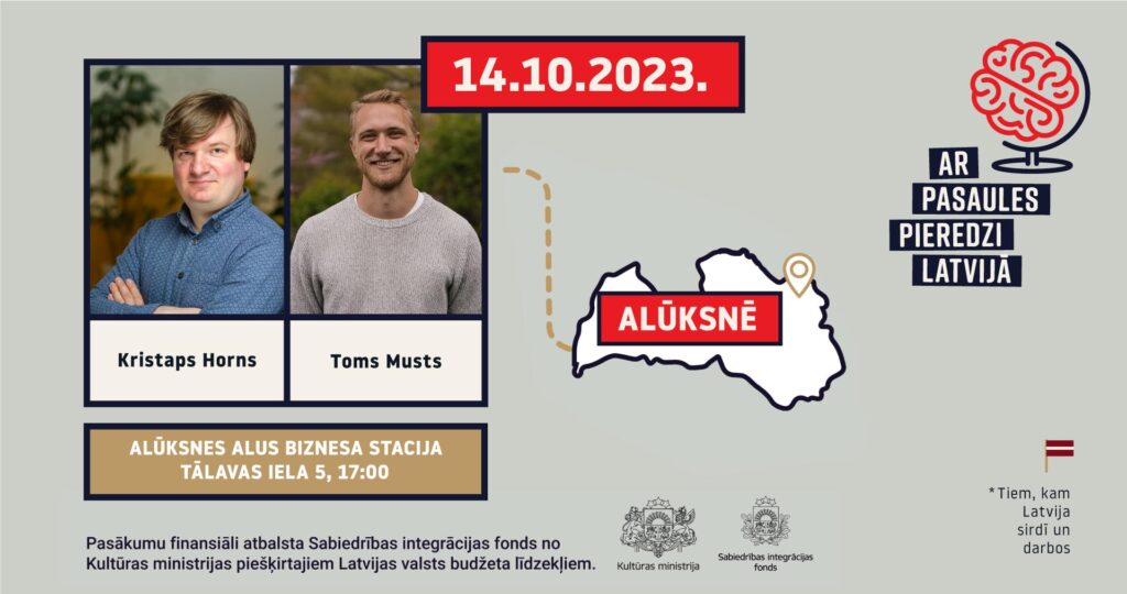Biedrība “Ar pasaules pieredzi Latvijā” 14. oktobrī viesosies Alūksnē ar iedvesmojošu pieredzes stāstu vakaru. Tikšanās noritēs Alūksnes alus Biznesa stacijā, un pieredzē dalīsies Kristaps Horns un Toms Musts. Pasākums plānots no plkst. 17:00 līdz 19:00.
