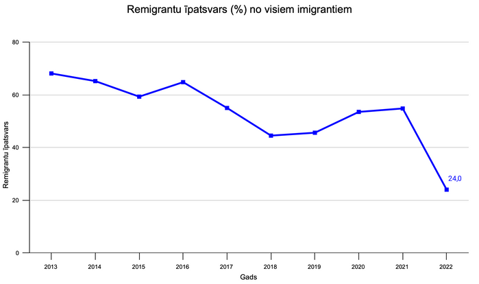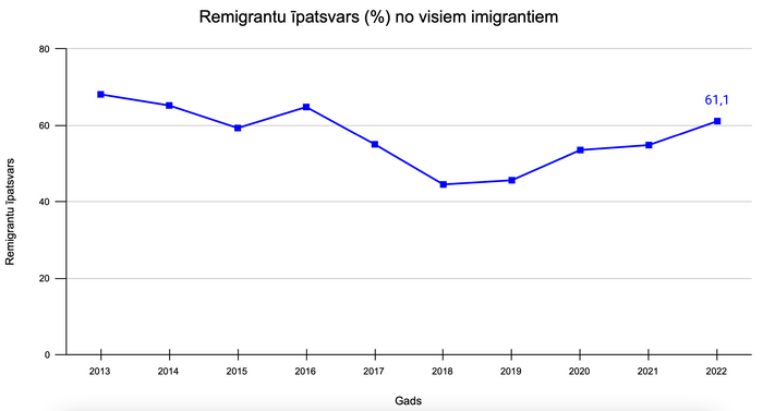 24 % – rekordzemu remigrācijas līmeni pagājušajā gadā uzrāda Centrālās statistikas pārvaldes dati. Taču remigrantu īpatsvara kritums vēl nenozīmē, ka remigrantu pērn patiešām bija mazāk nekā iepriekš, tieši otrādi – absolūtos skaitļos redzams, ka ir pieaudzis to iebraucēju skaits, kas ir Latvijas pilsoņi un nepilsoņi, kā arī iedzīvotāji, kuru valstiskā piederība ir cita, bet dzimšanas vieta – Latvija. Tādu 2022. gadā bija 9,3 tūkstoši, un tas ir lielākais skaits kopš 2013. gada.