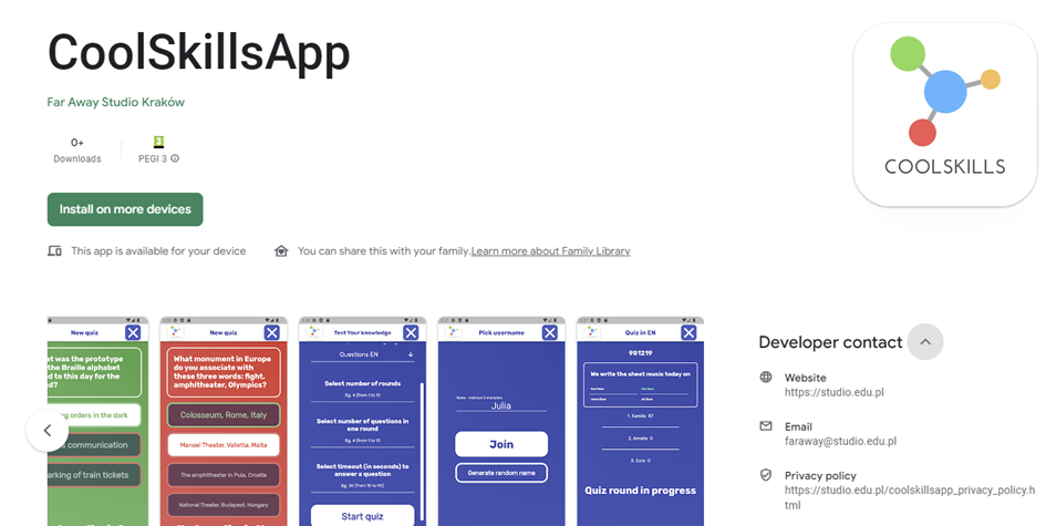 Atvērtā QuizApp ir pieejama tiešsaistē Play Veikalā, izmantojot “CoolSkillsApp”, “coolskillsapp” vai līdzīgu (svarīgi — neizmantojiet atstarpi, “cool skills app” netiks atrasta).