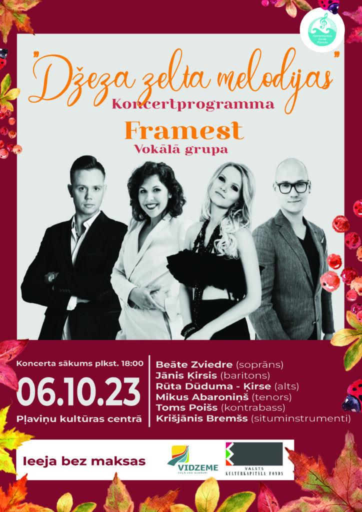 Šī gada kamermūzikas dienas atklāsim 6.oktobrī plkst. 18.00 Pļaviņu Kultūras centrā ar vokālās grupas “Framest” koncertprogrammu “Džeza zelta melodijas”.